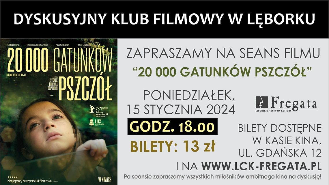 Lęborskie Centrum Kultury "Fregata" zaprasza na seans w ramach Dyskusyjnego Klubu Filmowego. W poniedziałek, 15 stycznia 2024 roku, odbędzie się pokaz filmu "20 000 gatunków pszczół". Początek o godzinie 18. Po seansie zapraszamy wszystkich miłośników ambitnego kina na dyskusję. Wstęp na seans kosztuje 13 złotych. Bilety można rezerwować i kupować za pośrednictwem strony www.lck-fregata.pl oraz w kasie kina.