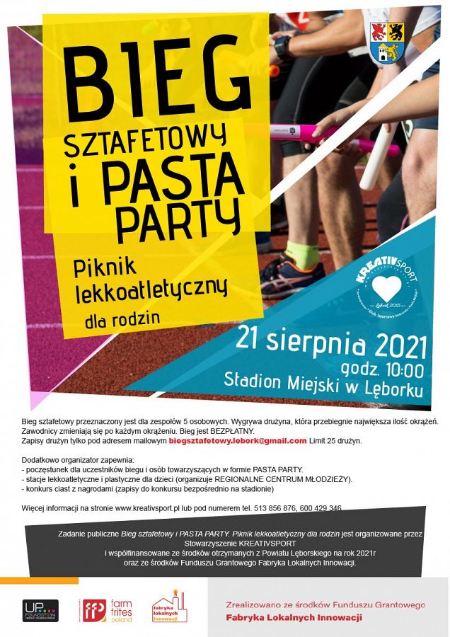 Bieg sztafetowy i PASTA PARTY. Piknik lekkoatletyczny dla rodzin jest współfinansowany ze środków otrzymanych z Powiatu Lęborskiego na rok 2021r oraz ze środków Funduszu Grantowego Fabryka Lokalnych Innowacji.