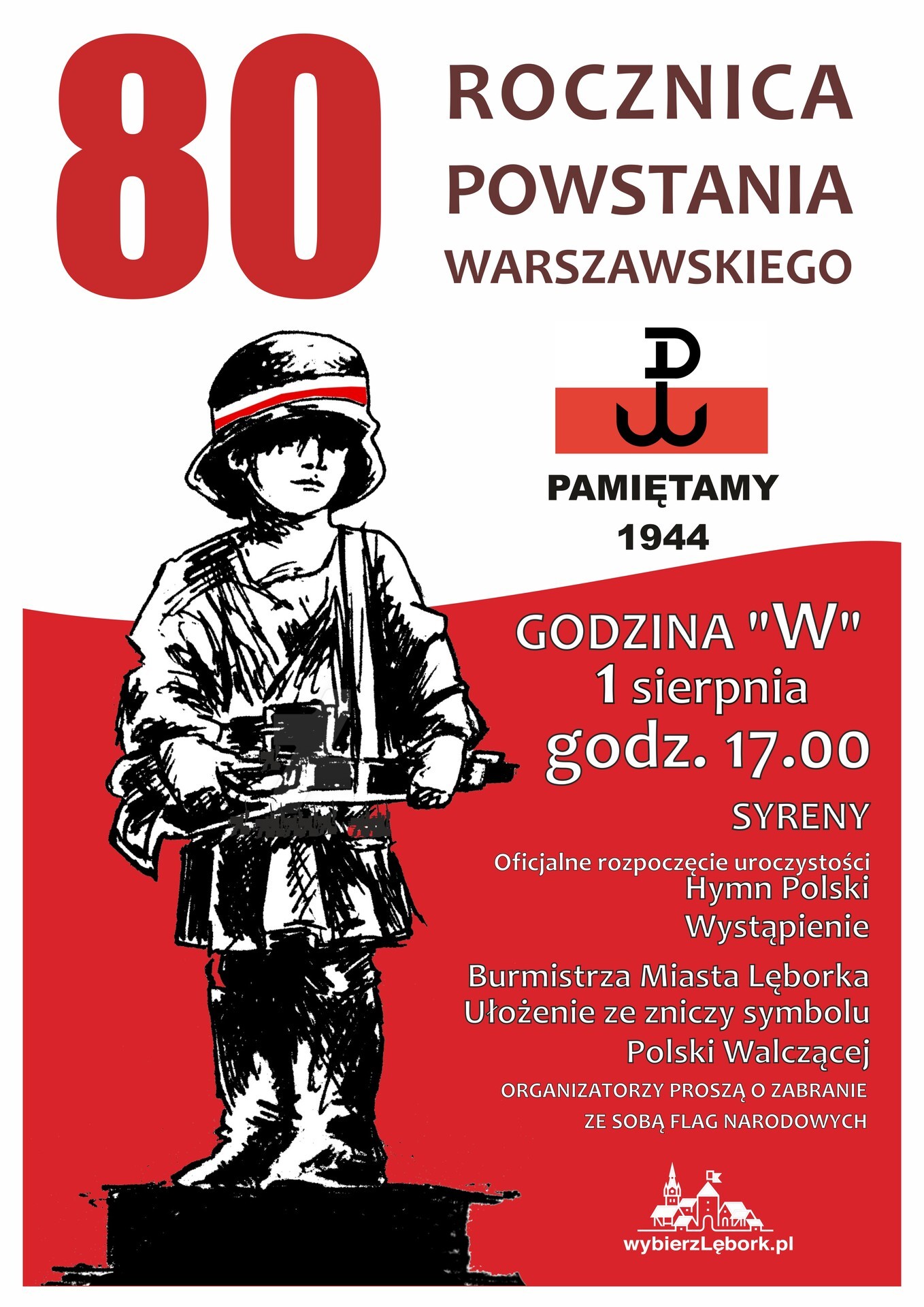 W czwartek 1 sierpnia o godzinie 17.00 na Placu Pokoju odbędą się uroczystości upamiętniające 80. rocznicę Powstania Warszawskiego. O godz. 17.00 w całym mieście zabrzmią syreny, aby oddać hołd uczestnikom i ofiarom tego wydarzenia. Mieszkańców Lęborka zapraszamy do udziału w uroczystościach.