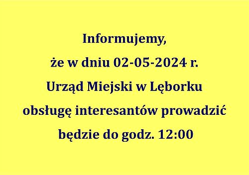 Informujemy, że w dniu 02-05-2024 r. Urząd Miejski w Lęborku obsługę interesantów prowadzić będzie do godz. 12:00.