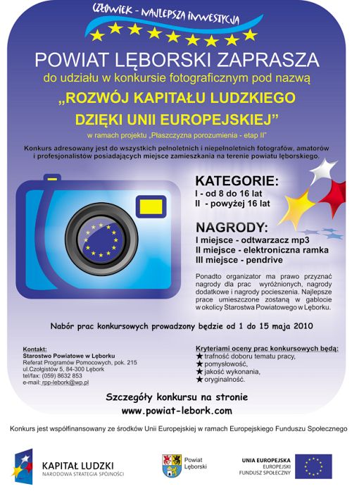 Do udziału w konkursie fotograficznym pn. Rozwój kapitału ludzkiego dzięki Unii Europejskiej zaprasza Starostwo Powiatowe w Lęborku.- Klub Turystyki Kolarskiej „Na Fali" Oddziału PTTK Marynarki Wojennej w Gdyni organizuje w dniach 30 kwietnia - 3 maja 2010r. kolejną edycję corocznej imprezy turystycznej pn. V Ogólnopolska Rowerowa Majówka na Kaszubach.