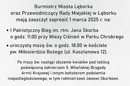 Obchodzony 1 marca Dzień Pamięci Żołnierzy Wyklętych to nie tylko czas refleksji nad heroizmem tych ludzi, ale również okazja do wyrażenia wdzięczności za ich poświęcenie dla naszej wolności. 1 marca br. w kościele pw. Miłosierdzia Bożego odprawiona została przez ks. Rafała Cieszyńskiego uroczysta Msza Święta podczas której oddano hołd żołnierzom podziemia antykomunistycznego. Pod tablicą upamiętniającą bohaterów 5. Wileńskiej Brygady Armii Krajowej oraz inne wybitne postacie ruchu niepodległościowego, w tym rotmistrza Jana Skorba, złożono kwiaty i zapalono znicze. Krótkie przemówienie wygłosił burmistrz Lęborka Jarosław Litwin, uczestnicy wydarzenia odśpiewali też „Mazurek Dąbrowskiego”.