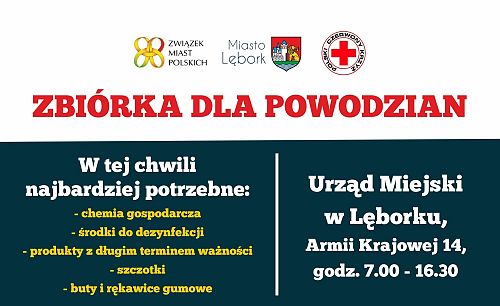 Z dniem 27 września 2024 roku o godzinie 12:00 zakończymy zbiórkę darów dla osób poszkodowanych przez powódź. Do tego czasu dary można przekazywać do ratusza w godzinach 7:00–16:30 (w piątek, 27 września, do godziny 12:00) lub bezpośrednio do Szkoły Podstawowej nr 8 w Lęborku, gdzie dary będą zbierane w czwartek, 26 września, oraz w piątek, 27 września, w godzinach 16:00–21:00.