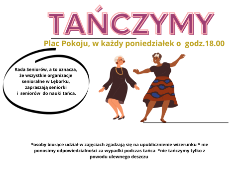 Gminna Rada Seniorów zaprasza seniorów i seniorki co poniedziałek do wspólnego tańca na placu Pokoju. Nauka tańca i tańce rozpoczyna się zawsze o godzinie 18:00 przy dobrej pogodzie.