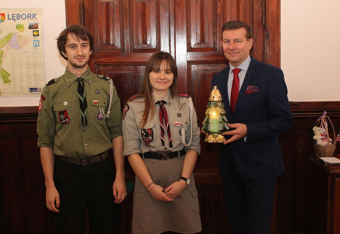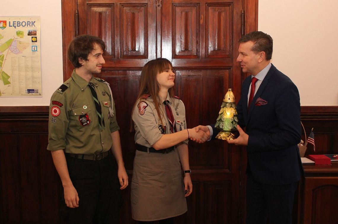 Betlejemskie Światło Pokoju dotarło 21 grudnia br. do ratusza. Lampion z ogniem z Betlejem z rąk komendanta Hufca ZHP Lębork phm. Agnieszki Stenki i z-cy kom. tpwd. Bartosza Filipów odebrał Zastępca Burmistrza Marian Kurzydło. W niedzielę 23 grudnia lęborscy harcerze podzielą się światłem z mieszkańcami. Przekazanie Betlejemskiego Światła Pokoju odbędzie się na placu Pokoju w godzinach od 10 do 12.