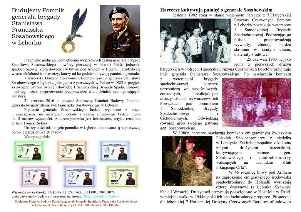 11 listopada br. po zakończeniu uroczystości przed Obeliskiem Niepodległości oraz w LCK „Fregata”, po wspólnym śpiewaniu pieśni patriotycznych, harcerze ze Społecznego Komitetu Budowy Pomnika generała brygady Stanisława Franciszka Sosabowskiego w Lęborku, będą rozprowadzali cegiełki na budowę pomnika.