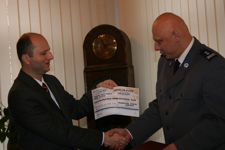 Policjanci z Komendy Powiatowej Policji w Lęborku otrzymali od miasta wsparcie finansowe na modernizację i rozbudowę stanowiska monitoringu miejskiego oraz na pokrycie kosztów zakwaterowania i wyżywienia słuchaczy Szkoły Policji w Słupsku. Symboliczny czek bankowy odebrał z rąk Burmistrza Włodzimierza Klaty podinspektor Jacek Partyka, Komendant Powiatowy Policji.