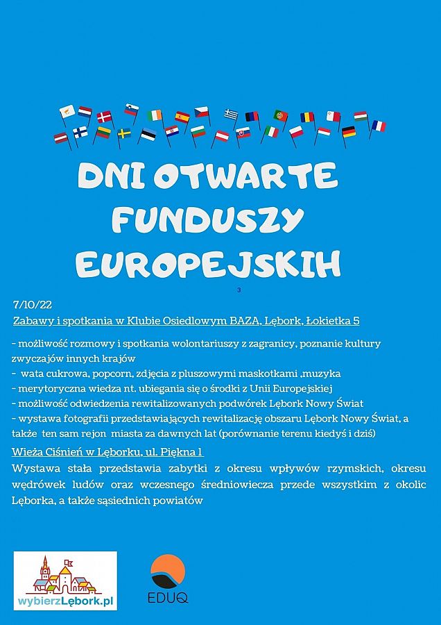 W dniach 7-9 października 2022 r. w całej Polsce odbędą się Dni Otwarte Funduszy Europejskich 2022 (DOFE). Również w Lęborku będzie można zobaczyć jak fundusze unijne są wykorzystywane w naszym mieście.