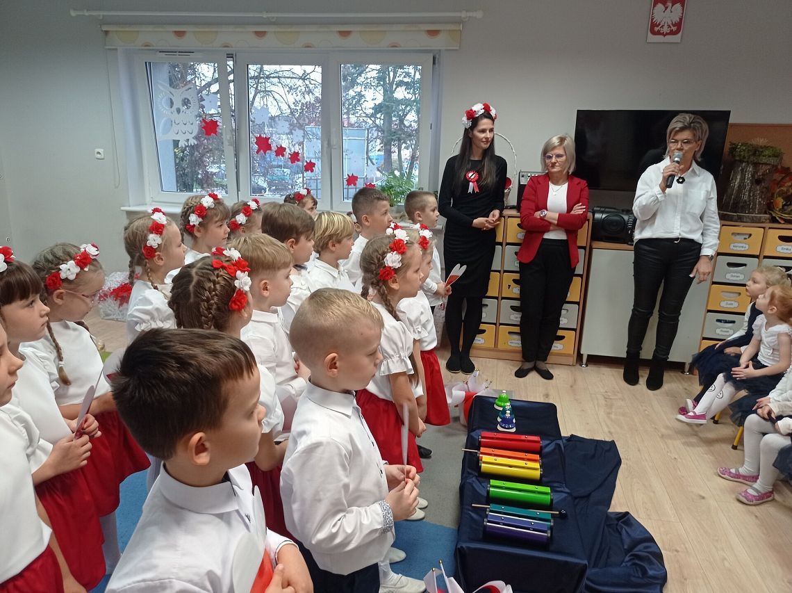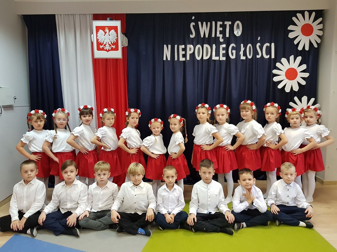 Narodowy Dzień Niepodległości wierszem, tańcem i piosenką uświetniła grupa starszaków pod kierunkiem pań A. Gapińskiej i A. Przybylskiej.