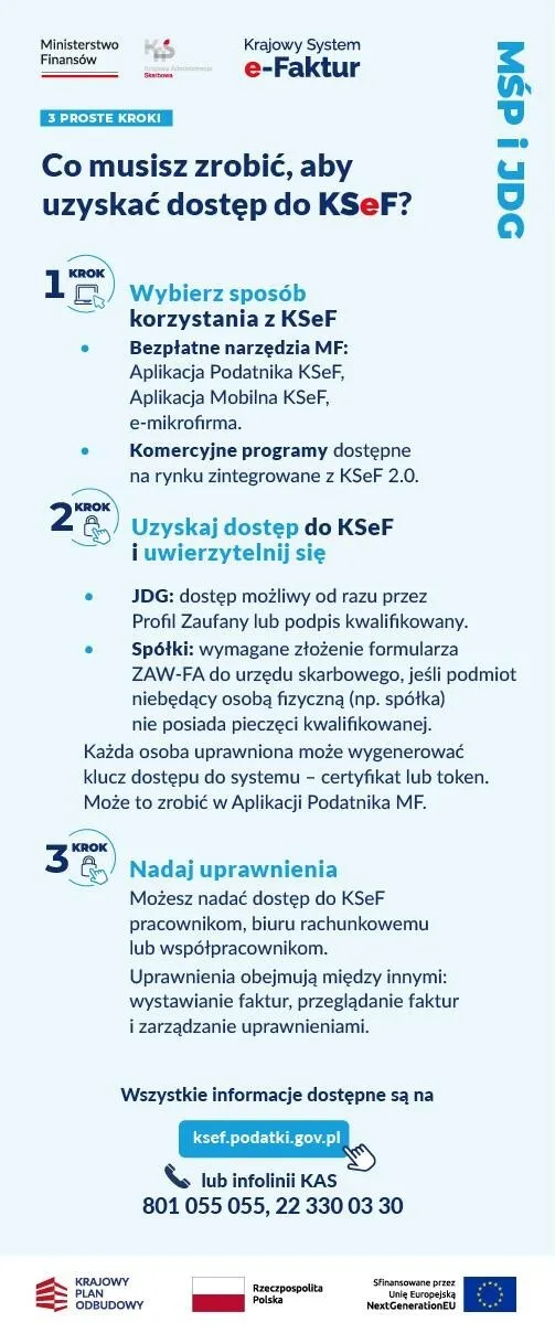 Więcej informacji nt. szkoleń i Krajowego Systemu e-Faktur znajdziesz na stronie https://ksef.podatki.gov.pl/ oraz na infolinii Krajowej Informacji Skarbowej (KIS) pod numerem: 22 330 03 30.