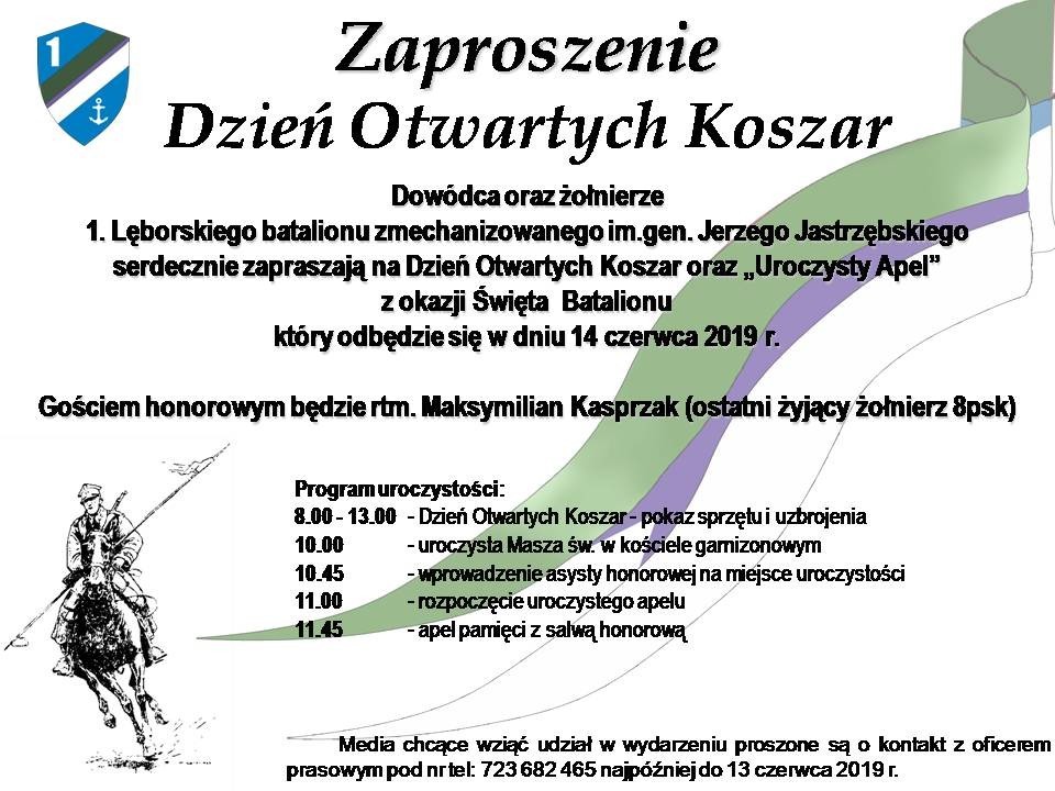 W dniu 14 czerwca 2019 r. dowódca oraz żołnierze 1. Lęborskiego batalionu zmechanizowanego im.gen. Jerzego Jastrzębskiego serdecznie zapraszają na Dzień Otwartych Koszar oraz „Uroczysty Apel” z okazji Święta Batalionu. W programie uroczysta msza w kościele garnizonowym oraz pokaz sprzętu wojskowego.