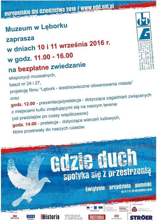 Muzeum w Lęborku, w ramach tegorocznych Europejskich Dni Dziedzictwa odbywających się pod hasłem Gdzie duch spotyka się z przestrzenią – świątynie, arcydzieła, pomniki zaprasza w dniach 10 i 11 września br. w godz. 11.00-16.00 na bezpłatne zwiedzanie ekspozycji muzealnych, baszt nr 24 i 27, projekcje filmu pt. Lębork – średniowieczne obwarowania miasta oraz – o godz. 12.00 prezentację dotyczącą zagadnień związanych z miejscami kultu znajdującymi się na naszym terenie, o godz. 14.00 prelekcję o wierzeniach ludowych, które przetrwały do naszych czasów.