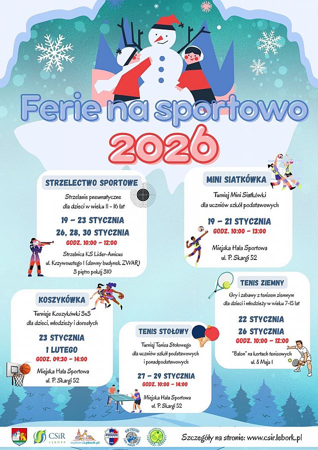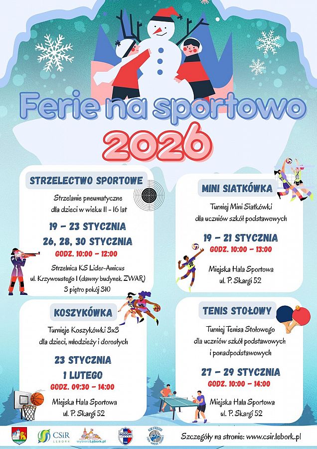Każdy uczestnik zawodów organizowanych przez Centrum Sportu i Rekreacji w Lęborku z cyklu "Ferie na sportowo 2026" powinien zapoznać się z obowiązującymi regulaminami i zgłosić się w miejscu zawodów z odpowiednią zgodą podpisaną przez rodzica lub opiekuna prawnego. Formularze można pobrać na stronie https://www.csir.lebork.pl/