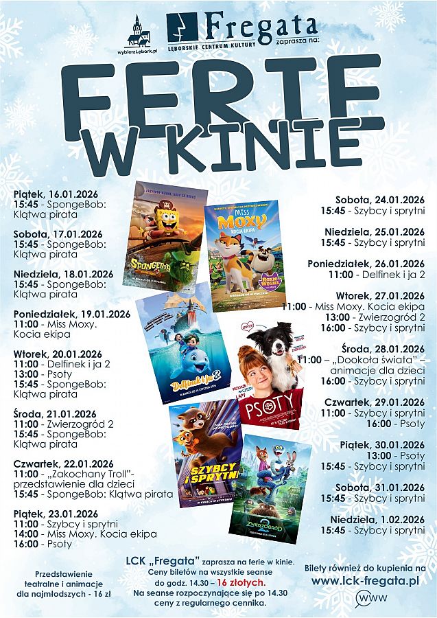 Lęborskie Centrum Kultury "Fregata” zaprasza na dzieci, młodzież i całe rodziny na wyjątkowe „Ferie w Kinie”. Na seanse rozpoczynające się do godz. 14:30 koszt biletu to 16 zł a na seanse po godz. 14:30 – ceny według regularnego cennika.