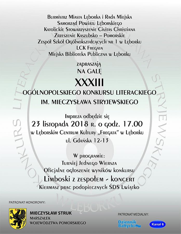 Tegoroczna gala XXXIII Ogólnopolskiego Konkursu Literackiego im. M. Stryjewskiego z ogłoszeniem wyników i wręczeniem nagród odbędzie się w piątek 23 listopada o godz. 17.00 w sali LCK „Fregata” przy ul. Gdańskiej. W programie również Turniej Jednego Wiersza oraz występ Limboskiego z zespołem. Tradycyjnie, gali towarzyszył będzie kiermasz prac podopiecznych Środowiskowego Domu Samopomocy „Lwiątko”.