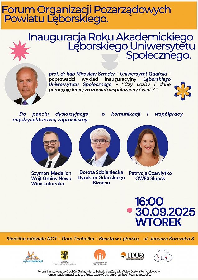 Centrum Organizacji Pozarządowych przy Stowarzyszeniu EDUQ w Lęborku zaprasza na Forum Subregionalne podczas którego odbędą się wybory do Powiatowej Rady Organizacji Pozarządowych Powiatu Lęborskiego oraz Inauguracja Roku Akademickiego Lęborskiego Uniwersytetu Społecznego.
