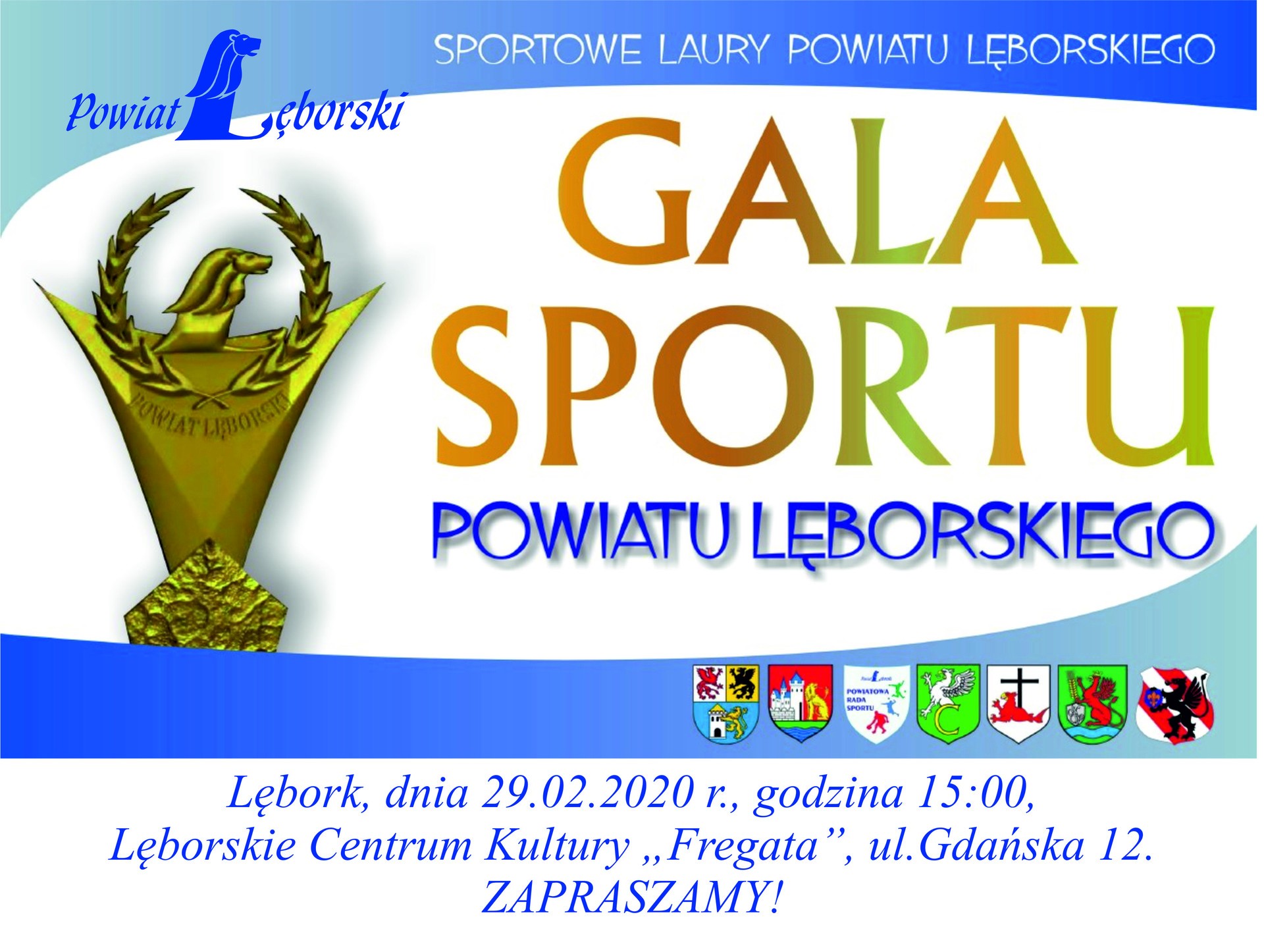 29 lutego br. o godz. 15.00 w sali kinowej Lęborskiego Centrum Kultury "Fregata" odbędzie się uroczysta XIII Gala Sportu Powiatu Lęborskiego. Podczas Gali najlepsi sportowcy, trenerzy, drużyny i działacze powiatu lęborskiego otrzymają wyróżnienia i nagrody Starosty Lęborskiego oraz „Sportowe Laury Powiatu Lęborskiego 2019”.