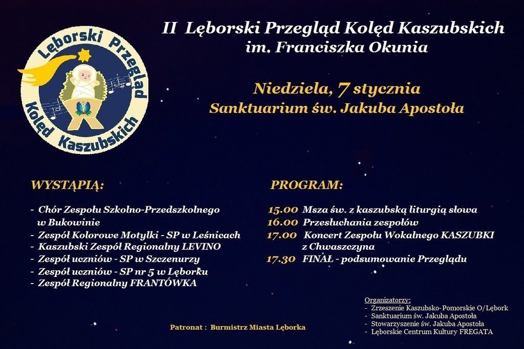 7 stycznia 2018 roku odbędzie się II Lęborski Przegląd Kolęd Kaszubskich im. Franciszka Okunia - w Sanktuarium św. Jakuba Ap., po mszy św. z kaszubską liturgią słowa. Do udziału w wydarzeniu zaproszonych zostało 7 zespołów z terenu naszego miasta i powiatu. Gościnnie wystąpi Zespół Wokalny „KASZUBKI” z Chwaszczyna.
