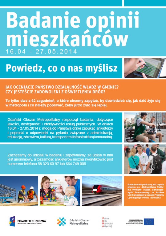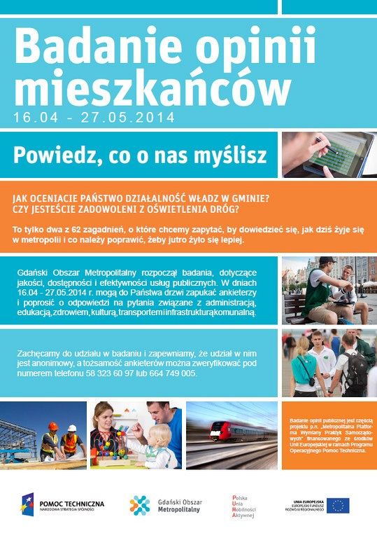 Na zlecenie Gdańskiego Obszaru Metropolitalnego w dniach 16 kwietnia - 27 maja br. do drzwi mieszkańców mogą zapukać ankieterzy. Pytania w kwestionariuszu będą dotyczyły różnych zagadnień życia codziennego: edukacji, zdrowia, transportu, kultury, infrastruktury komunalnej oraz administracji. Badanie ma na celu poznanie opinii mieszkańców o jakości, dostępności i efektywności usług publicznych.