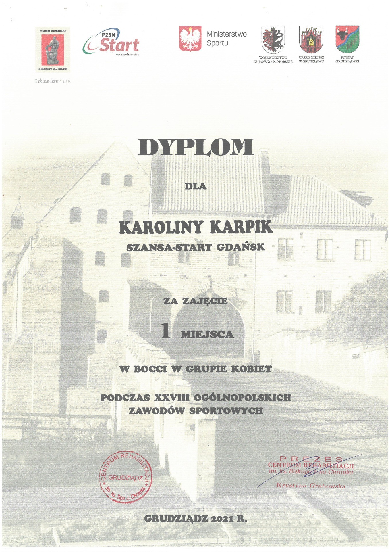 Podczas XXVIII Ogólnopolskich Zawodów Sportowych w Bocci, które odbyły się w dniach 4 grudnia br. w Grudziądzu lęborczanka zdobyła I miejsce w grupie kobiet. Gratulujemy Karolinie kolejnego sukcesu i życzymy kolejnych tak udanych startów.