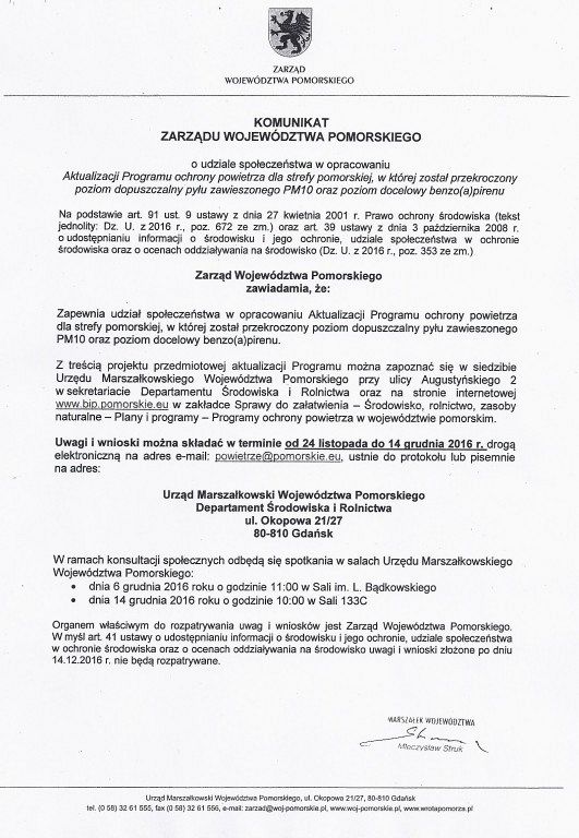 Zarząd Województwa Pomorskiego zapewniając udział społeczeństwa w opracowywaniu przedmiotowej aktualizacji Programu ochrony powietrza ogłosił konsultacje społeczne, które trwają od dnia 24 listopada do 14 grudnia 2016 roku.