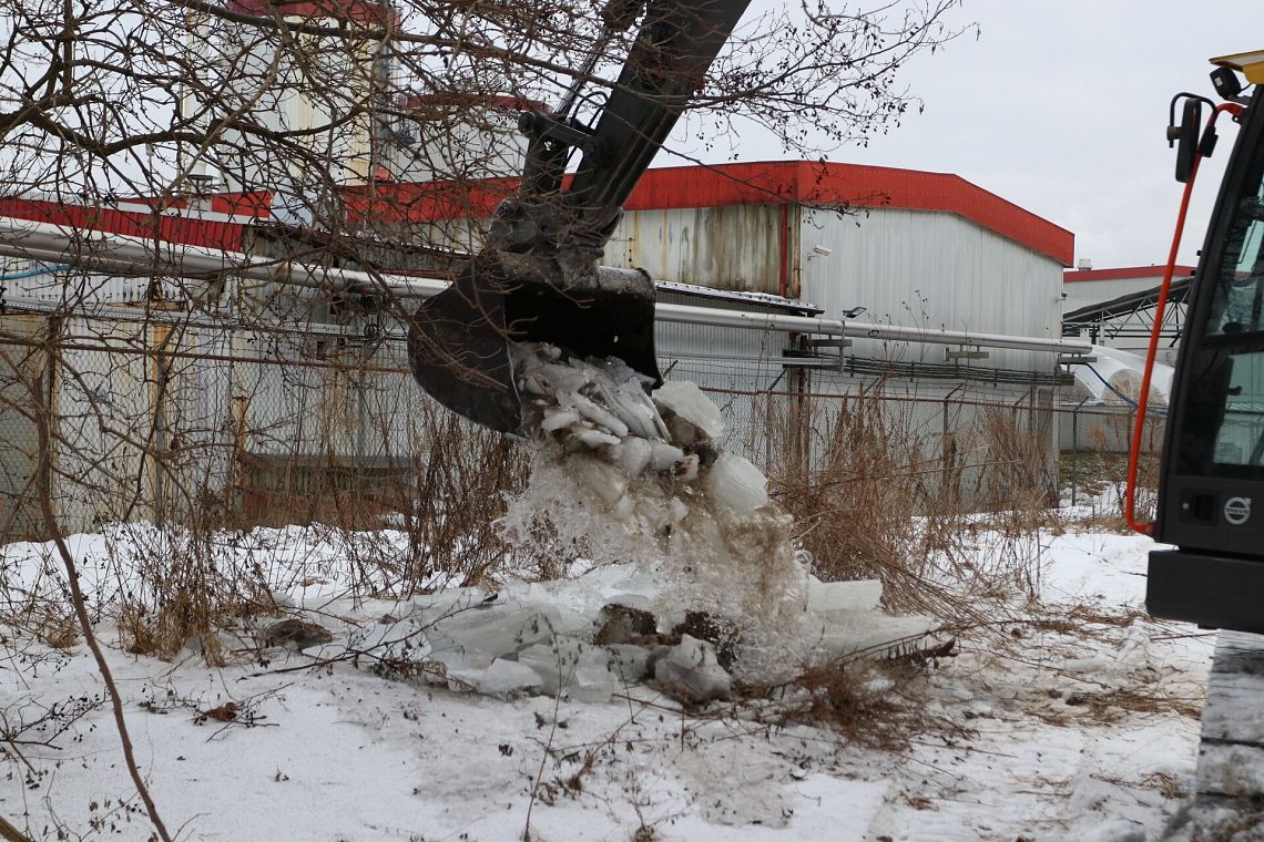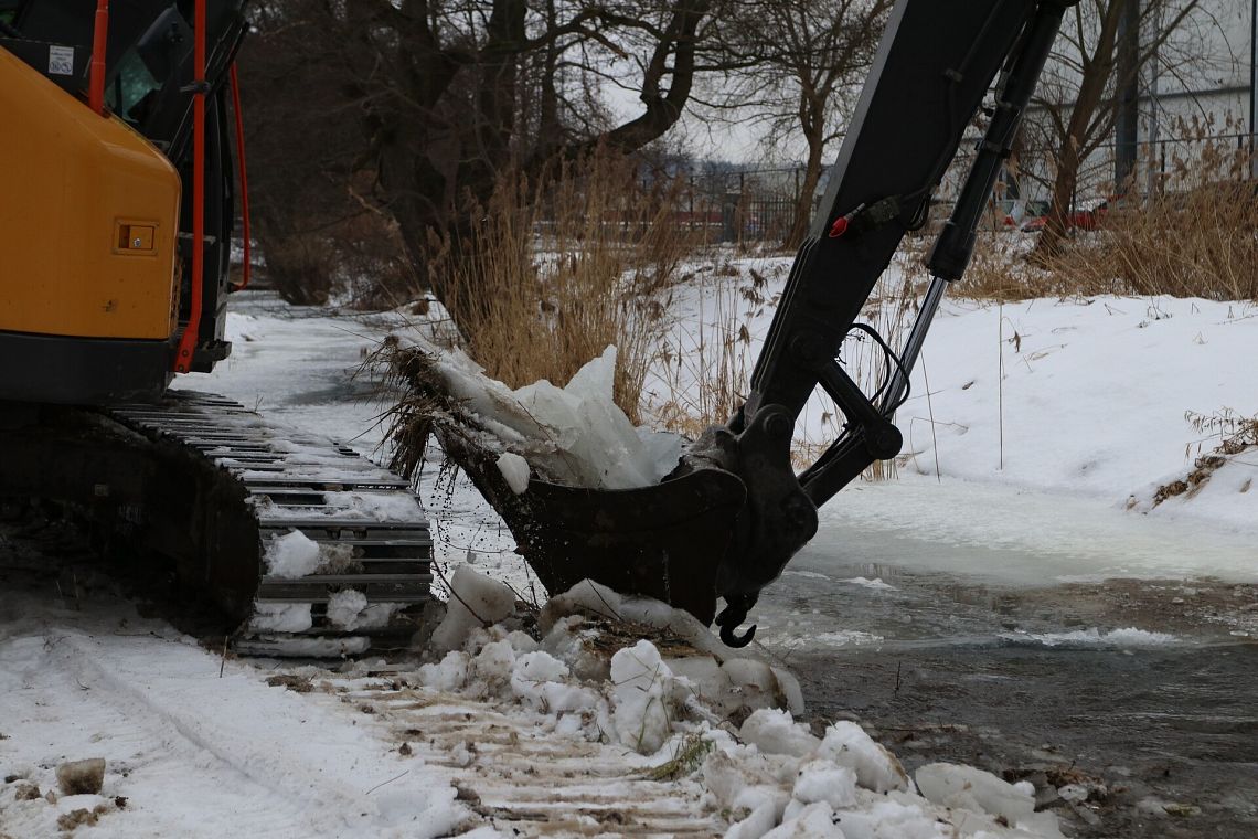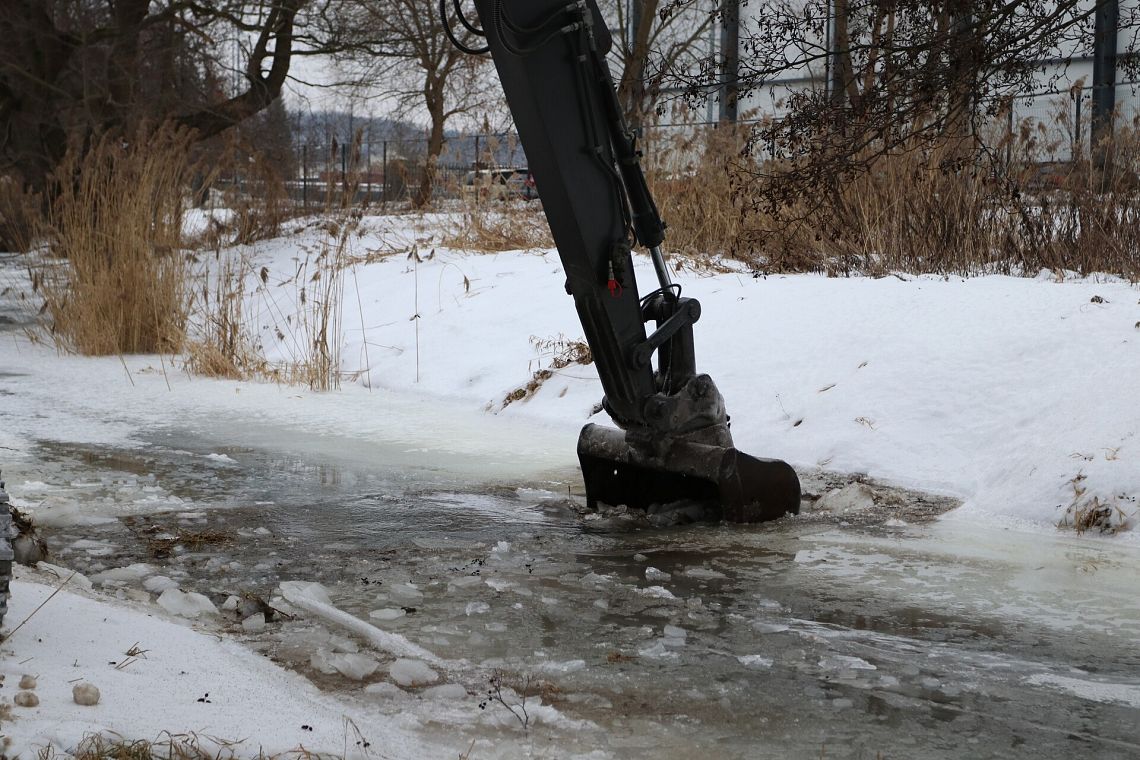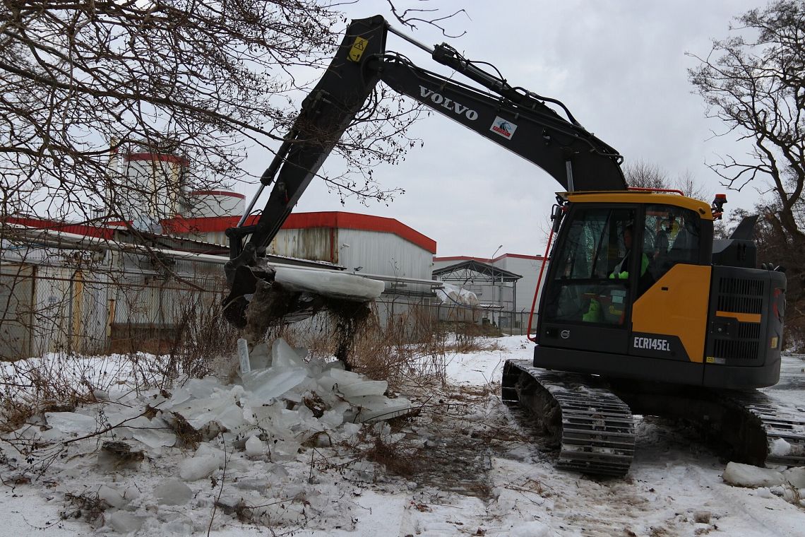 Koparki w akcji. Kruszenie grubego lodu na rzece Okalicy