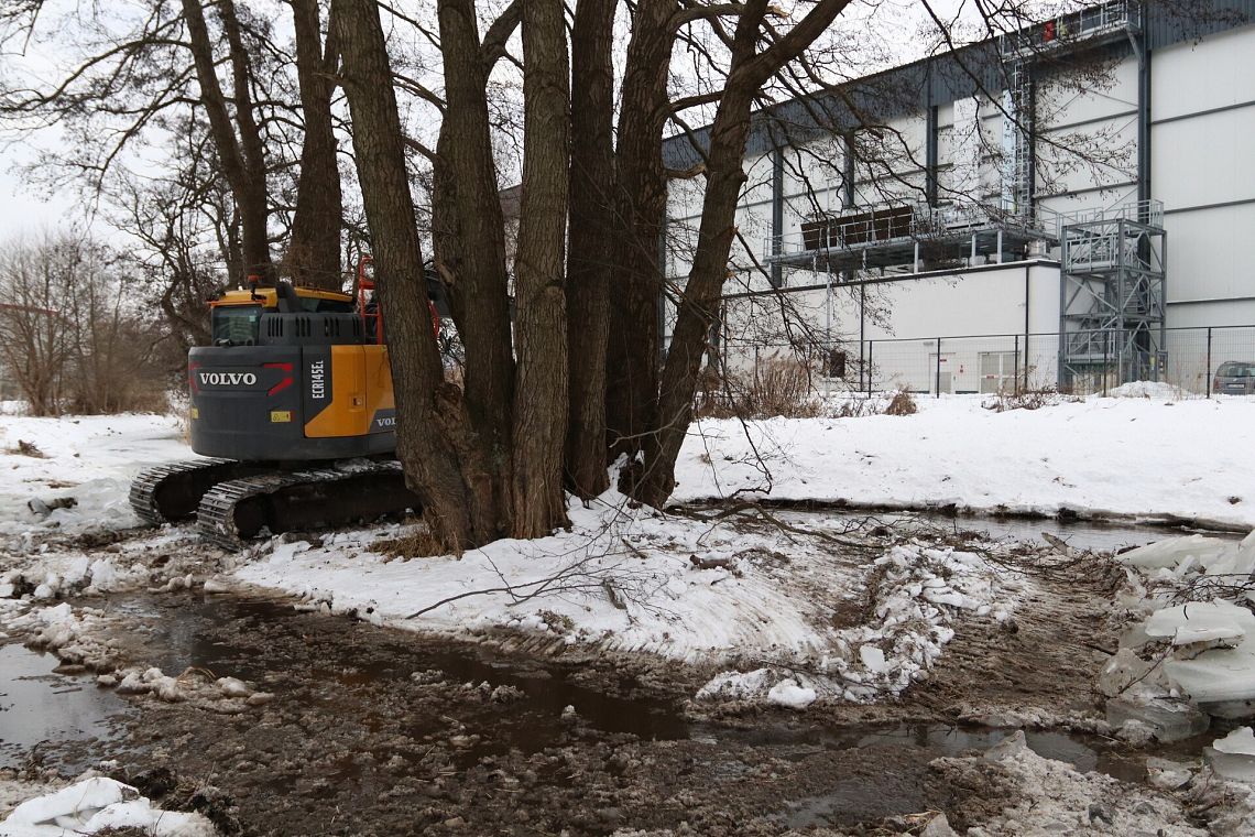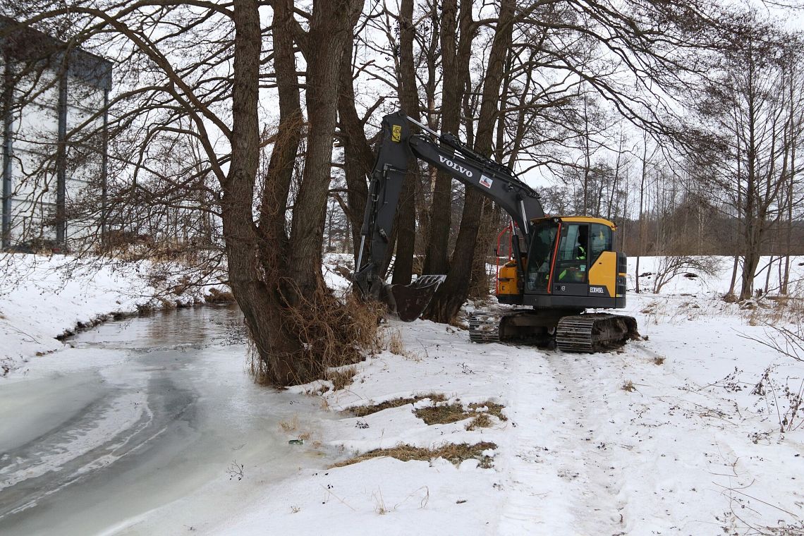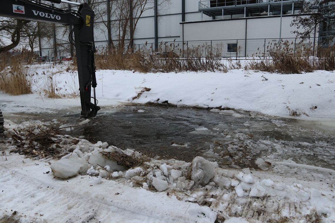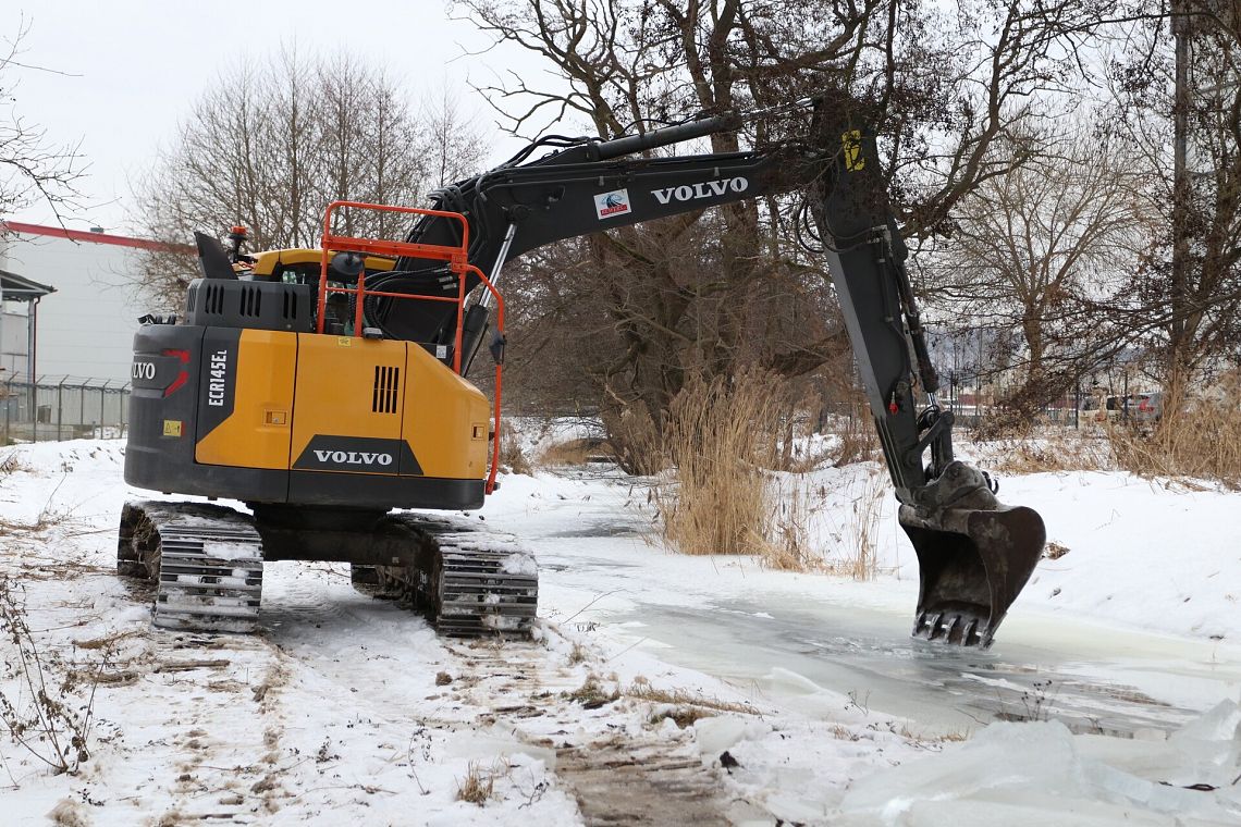 Koparki w akcji. Kruszenie grubego lodu na rzece Okalicy