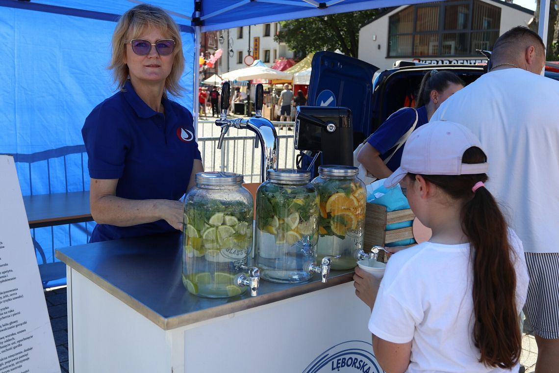 W upalny dzień Miejskie Przedsiębiorstwo Wodociągów i Kanalizacji przekonywało o zaletach picia lęborskiej „kranówki”, serwując spragnionym gościom jarmarku wodę także w wersji smakowej.