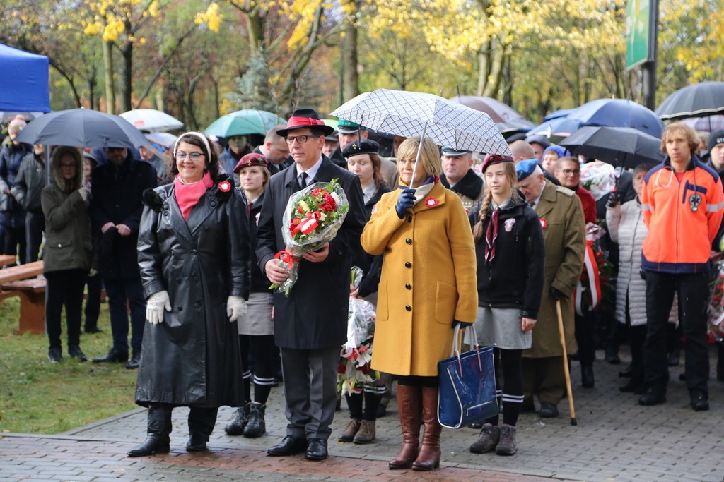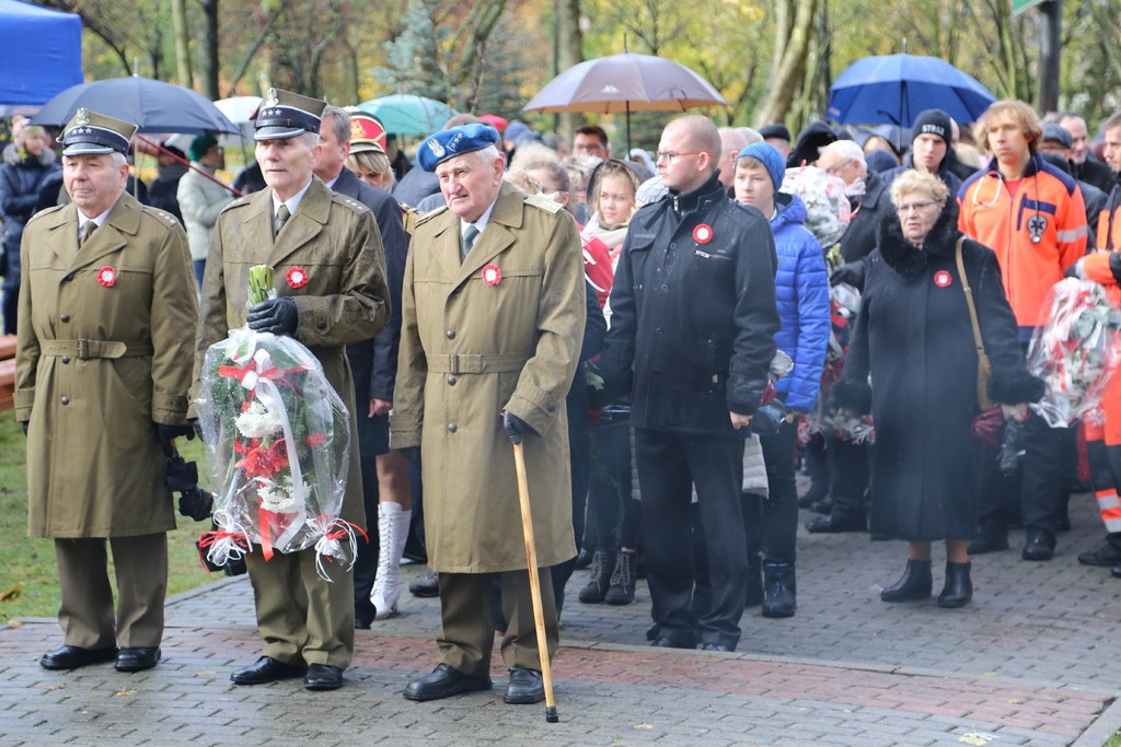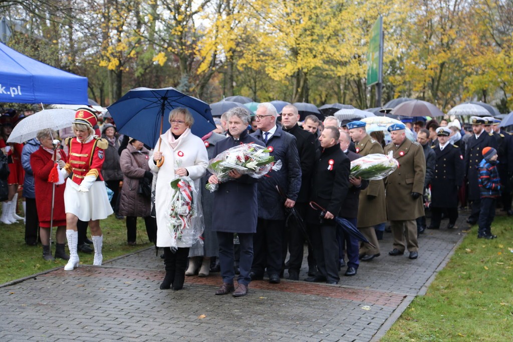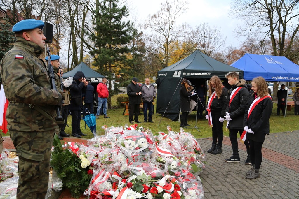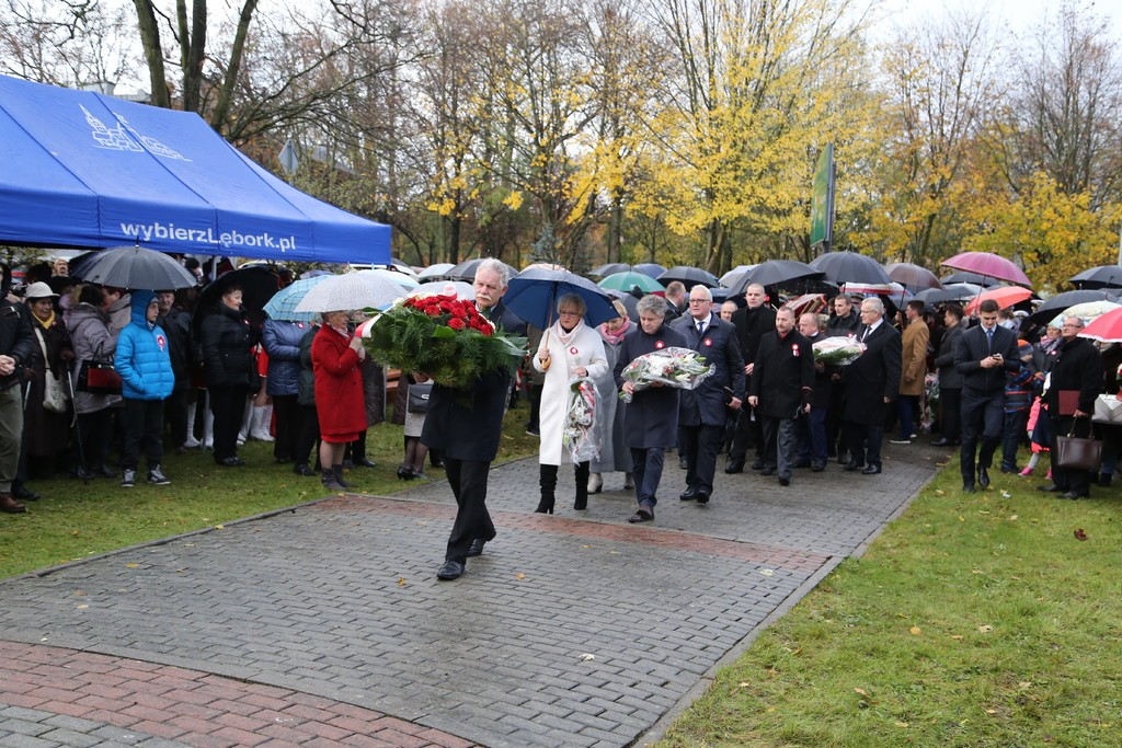 Pod Obeliskiem Niepodległości Orkiestra Dęta Ziemia Lęborska odegrała hymn państwowy a na masz uroczyście została wciągnięta biało – czerwona flaga. Wystąpienie okolicznościowe wygłosił Burmistrz Lęborka Witold Namyślak, który zachęcał do wspólnego świętowania. Po przemówieniu głos zabrał, obecny na uroczystości, Mariusz Łuczyk – Wicewojewoda Pomorski. Następnie kapitan Michał Sobczuk odczytał Apel Pamięci, po którym nastąpiła salwa honorowa. Znakomity montaż słowno-muzyczny przygotowali uczniowie Szkoły Podstawowej nr 5 w Lęborku im. Wojska Polskiego. Mimo niesprzyjającej aury kwiaty pod obeliskiem złożyły licznie przybyłe delegacje. Uroczystości pod Obeliskiem zakończyła parada rekonstruktorów. Dla wszystkich uczestników uroczystości przygotowano pyszną grochówkę.