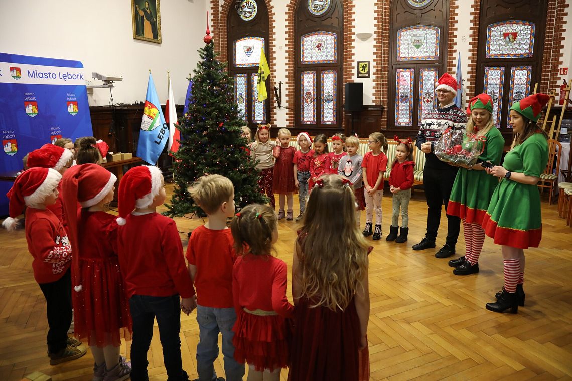 Na zakończenie dzieci złożyły świąteczne życzenia, a od burmistrza otrzymały słodki upominek, który wywołał jeszcze więcej uśmiechów.