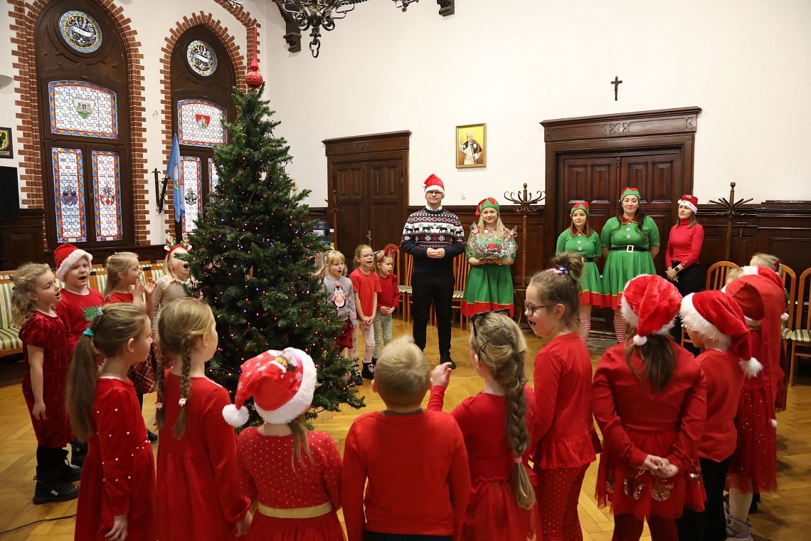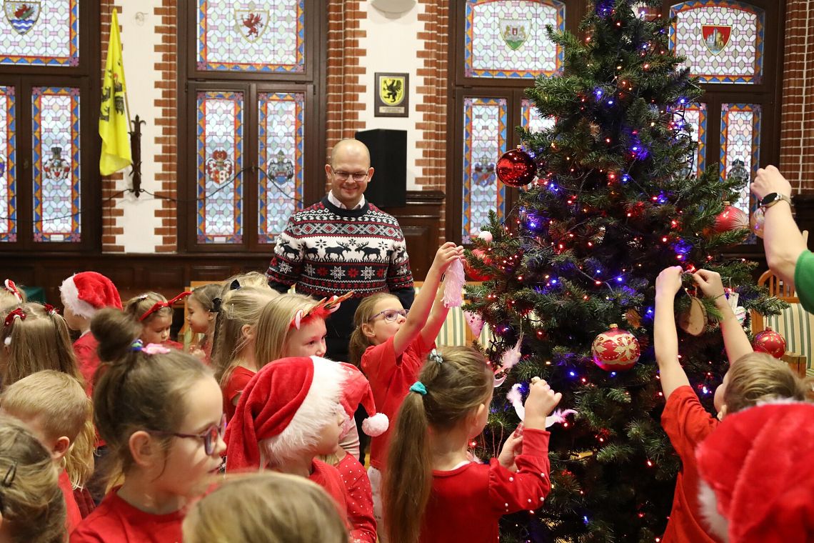 Ratuszowa choinka przyozdobiona! W grudniowe, piątkowe przedpołudnie w Sali Rajców dzieci z grupy „Misie” z Przedszkola nr 6 wspólnie z burmistrzem – Jarosławem Litwinem – przyozdobiły świąteczną choinkę.