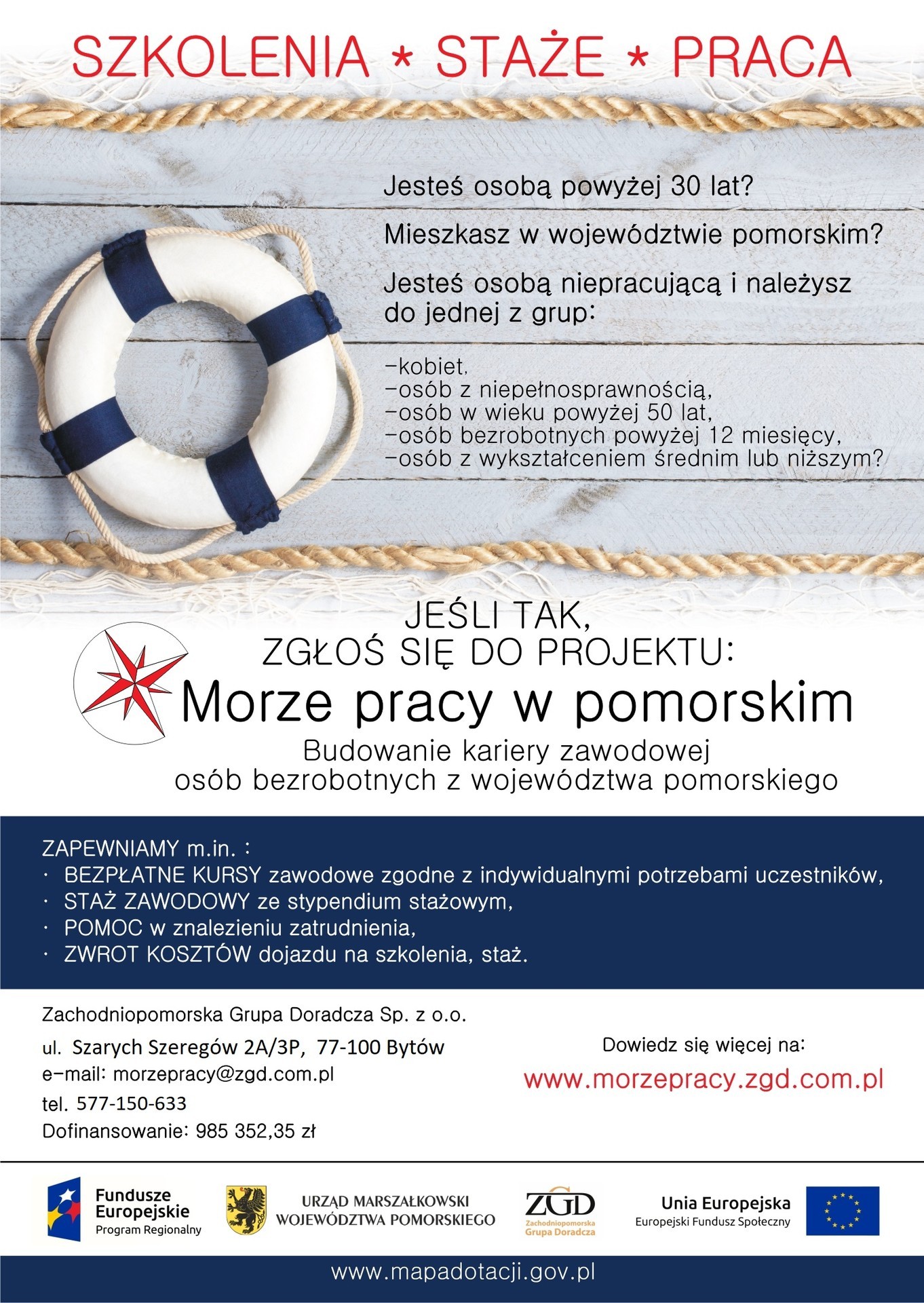 Zachodniopomorska Grupa Doradcza sp. z o.o. zaprasza mieszkańców województwa pomorskiego do udziału w projekcie „Morze pracy w pomorskim. Budowanie kariery zawodowej osób bezrobotnych z województwa pomorskiego”. Projekt zakłada uczestnictwo w szkoleniach zawodowych kończących się egzaminem oraz pomoc w znalezieniu zatrudnienia.
