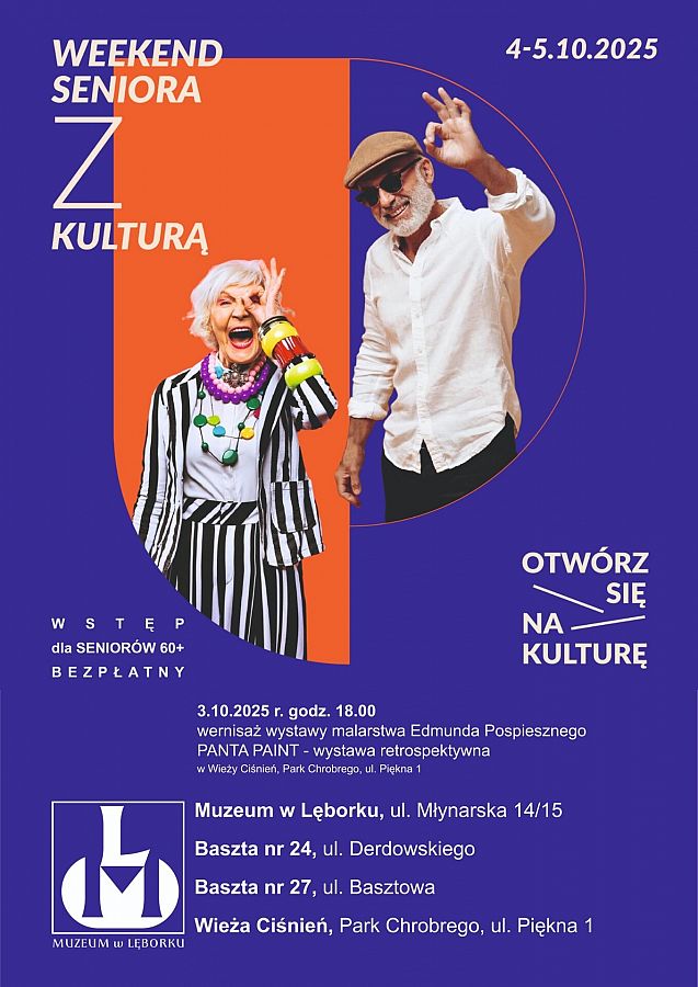 Muzeum w Lęborku włącza się w ogólnopolską akcję pn. „Weekend seniora z kulturą”, organizowaną przez Ministerstwo Kultury i Dziedzictwa Narodowego. Już w najbliższy weekend 4-5 października 2025 r. na odwiedziny seniorek i seniorów czeka Muzeum, Baszta nr 24, Baszta nr 27 oraz Wieża Ciśnień. A już dziś zapraszamy do Wieży Ciśnień na wystawę retrospektywną prac Edmunda Pospiesznego. Wstęp wolny.