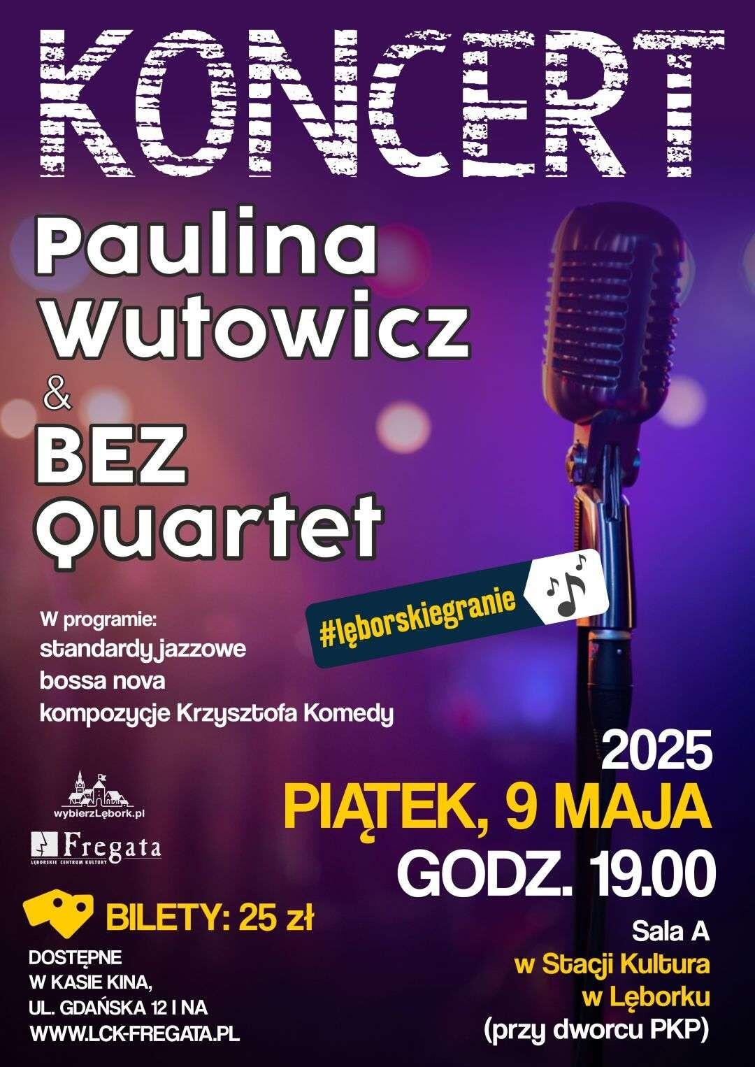 Lęborskie Centrum Kultury „Fregata” zaprasza na koncert Pauliny Wutowicz z grupą BEZ Quartet. Projekt z inicjatywy lęborczan - wokalistki Pauliny Wutowicz i perkusisty Janka Wróblewskiego - jest efektem ich kilkuletniej przyjaźni i współpracy. Towarzyszyć im będą Michał Staśkowiak (bas), Aleks Hejber (piano) i Wiktor Szerszeń (trąbka, flugelhorn) - wszyscy związani z Akademią Muzyczną w Bydgoszczy. Koncert odbędzie się w piątek, 9 maja 2025 roku w Stacji Kultura przy ulicy Dworcowej 8 w Lęborku. Początek o godzinie 19:00.