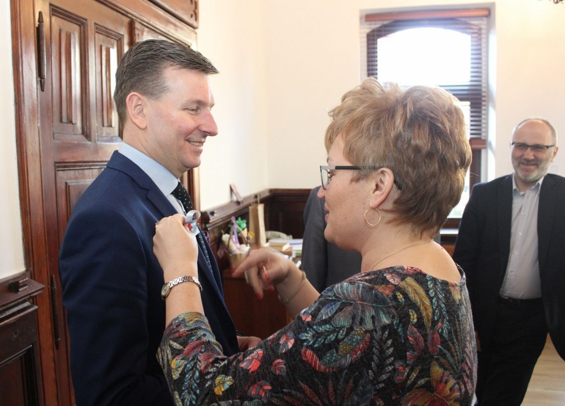2 kwietnia z niebieskimi wstążeczkami - symbolem autyzmu ratusz odwiedziły Panie prezes „Niebieskiego Skarbu” Agnieszka Pujsza-Pomorska i Emilia Wolska. Niebieskie wstążeczki symbolizują solidarność i pamięć o osobach z autyzmem. Osób takich jest coraz więcej, także w naszym mieście. Gości z „Niebieskiego Skarbu” przyjął Burmistrz Witold Namyślak, Zastępca Burmistrza Jerzy Pernal, Sekretarz Marian Kurzydło oraz gościnnie Dyrektor Zakładu Komunikacji Miejskiej w Lęborku Mirosław Siergiej.