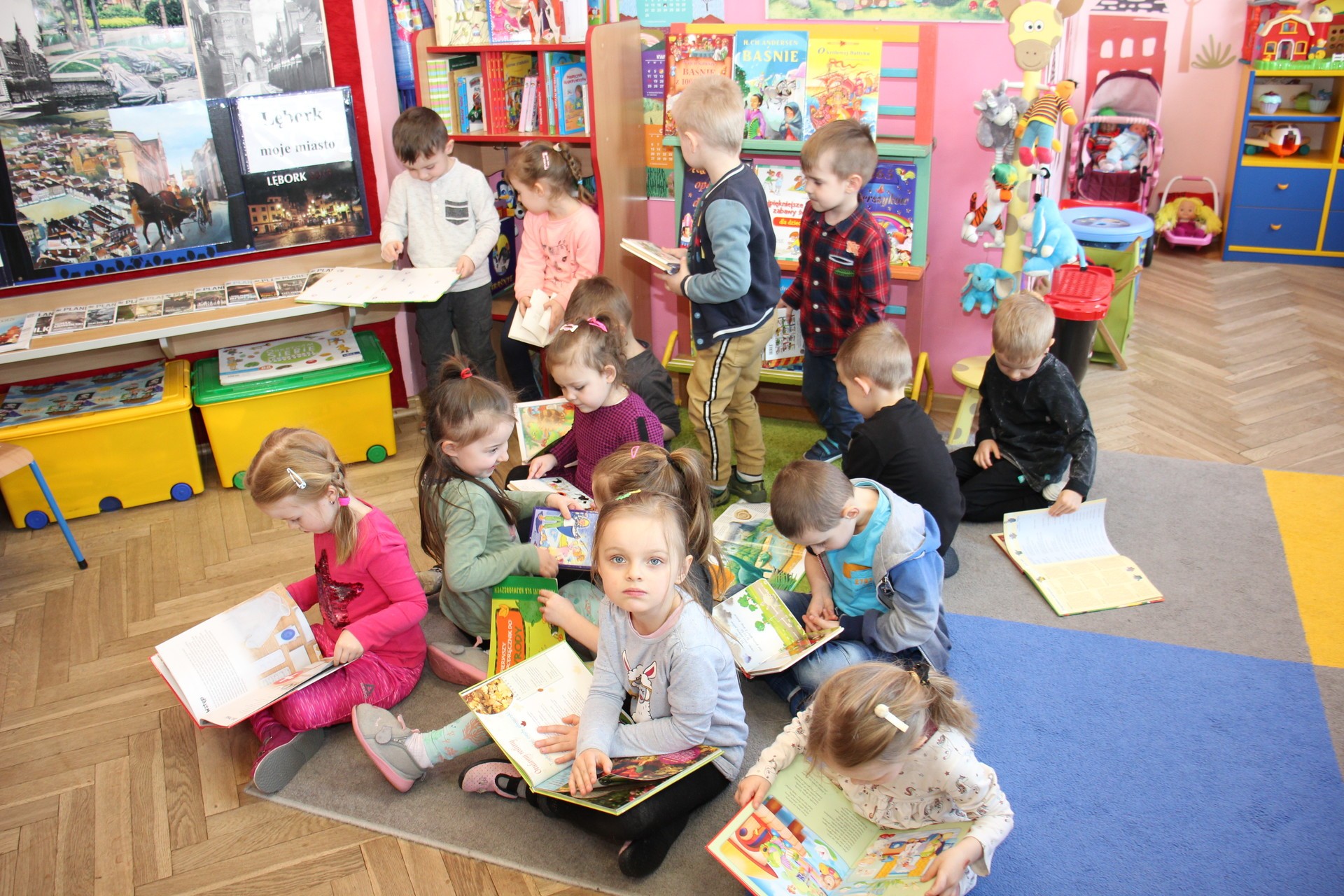 Na zdjęciach zajęcia z książkami w Przedszkolu nr 6 w Lęborku. Księgozbiór placówki liczy obecnie 1325 pozycji. W ramach dotacji planowany jest zakup m.in. atrakcyjnych książek z ruchomymi elementami a także pięknie wydanych picturebooków.