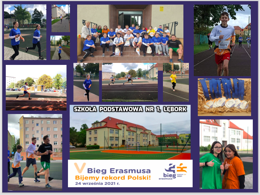 Uczniowie Szkoły Podstawowej nr 1 w Lęborku wzięli udział w V Biegu Erasmusa. Odbył się on 24 września br. pod patronatem Ministerstwa Kultury Dziedzictwa Narodowego i Sportu oraz Polskiego Komitetu Olimpijskiego. Hasło tegorocznej edycji biegu brzmiało Bijemy rekord Polski! Czteroosobowe drużyny sztafetowe uczniów biegały po szkolnym boisku przez godzinę. Chodziło jednak o to, aby w 60 minut pokonać jak najdłuższy dystans. Z całej Polski zgłosiło się ponad 1000 drużyn!