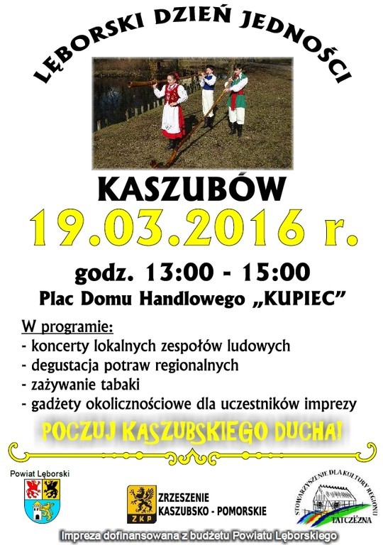 Na Lęborski Dzień Jedności Kaszubów zapraszają 19 marca br. organizatorzy: Zrzeszenie Kaszubsko-Pomorskie, Starostwo Powiatowe i Stowarzyszenie dla Kultury Regionu Tatczezna. W ramach Dnia Jedności Kaszubów w godz. 13.00-15.00 na placu przy DH „Kupiec” odbędą się koncerty lokalnych zespołów ludowych, degustacja potraw regionalnych, zażywanie tabaki.