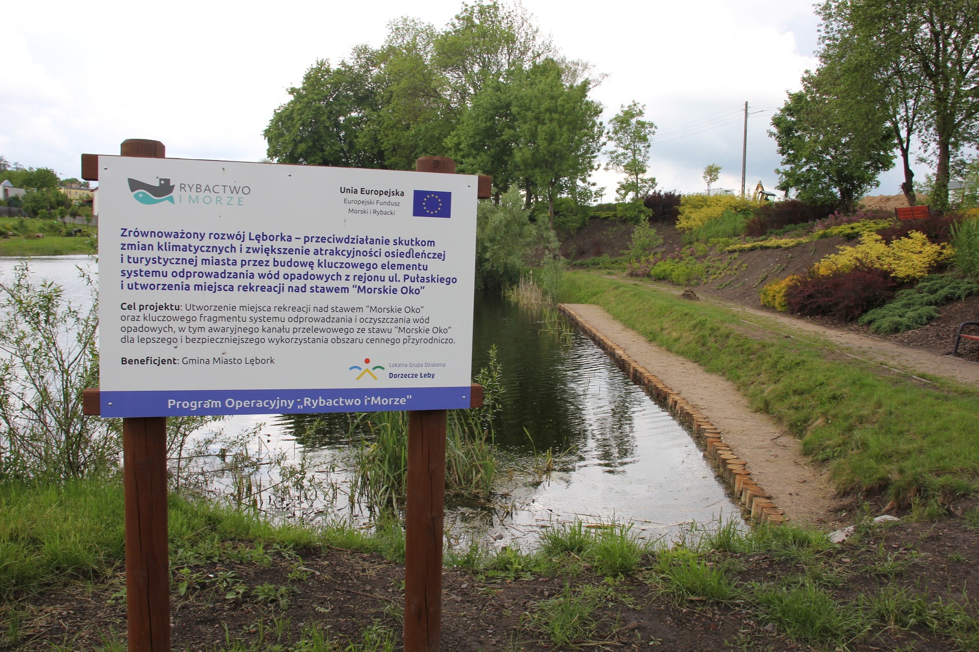 Projekt „Zrównoważony rozwój Lęborka – przeciwdziałanie skutkom zmian klimatycznych i zwiększenie atrakcyjności osiedleńczej i turystycznej miasta przez budowę kluczowego elementu systemu odprowadzania wód opadowych z rejonu ul. Pułaskiego i utworzenia miejsca rekreacji nad stawem „Morskie Oko” zrealizowano w ramach Lokalnej Strategii Rozwoju 2014-2020 dofinansowanej z Europejskiego Funduszu Morskiego i Rybackiego za pośrednictwem Stowarzyszenia Lokalna Grupa Działania „Dorzecze Łeby”.
