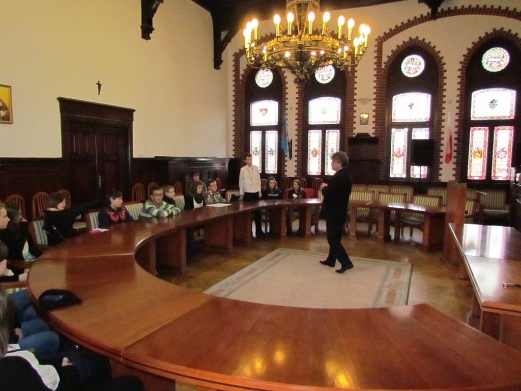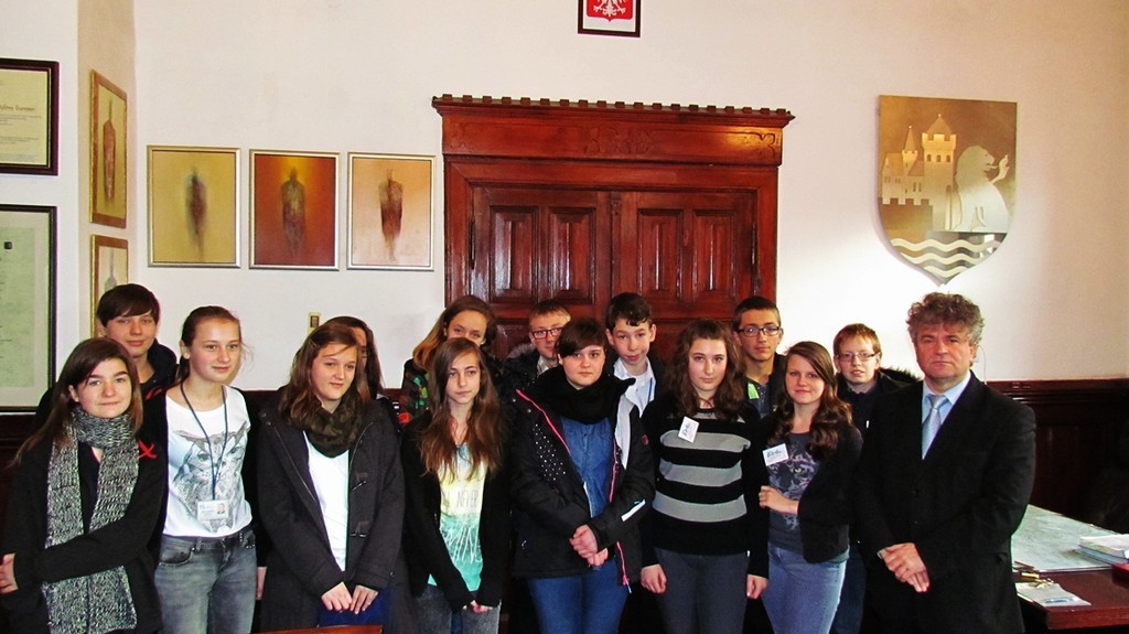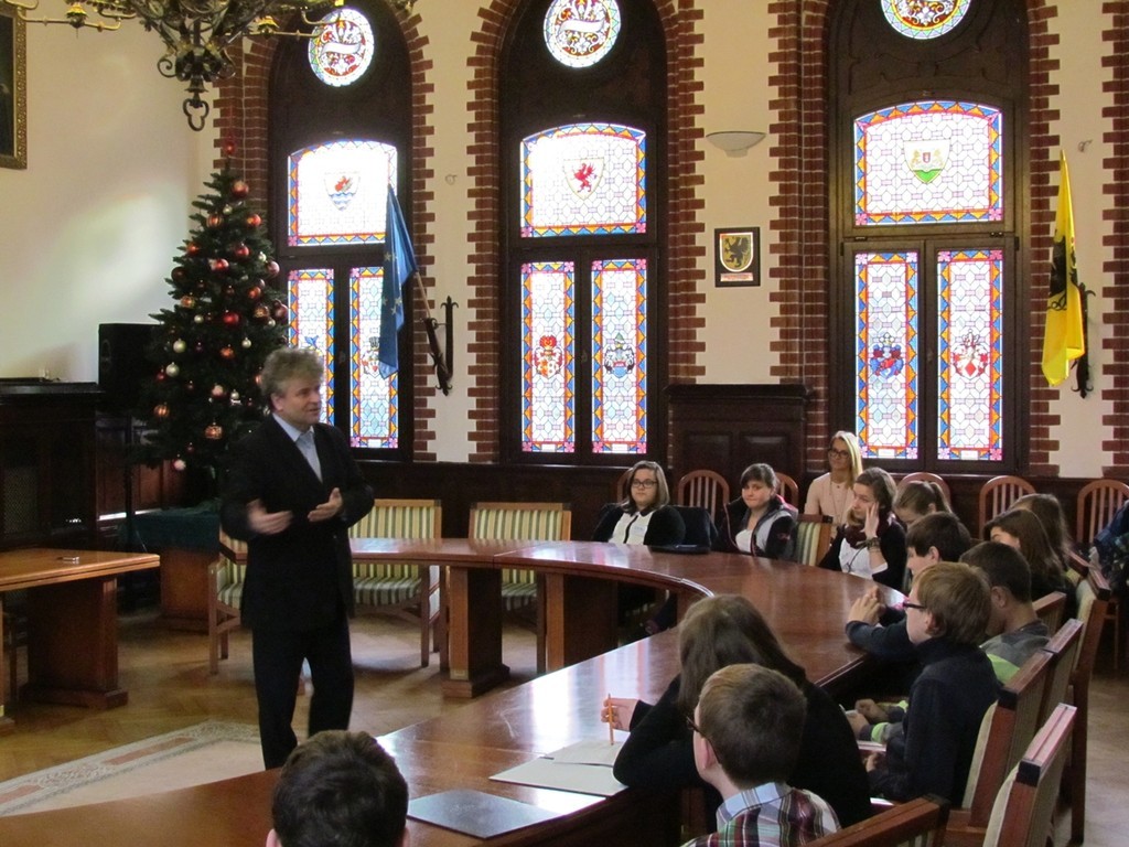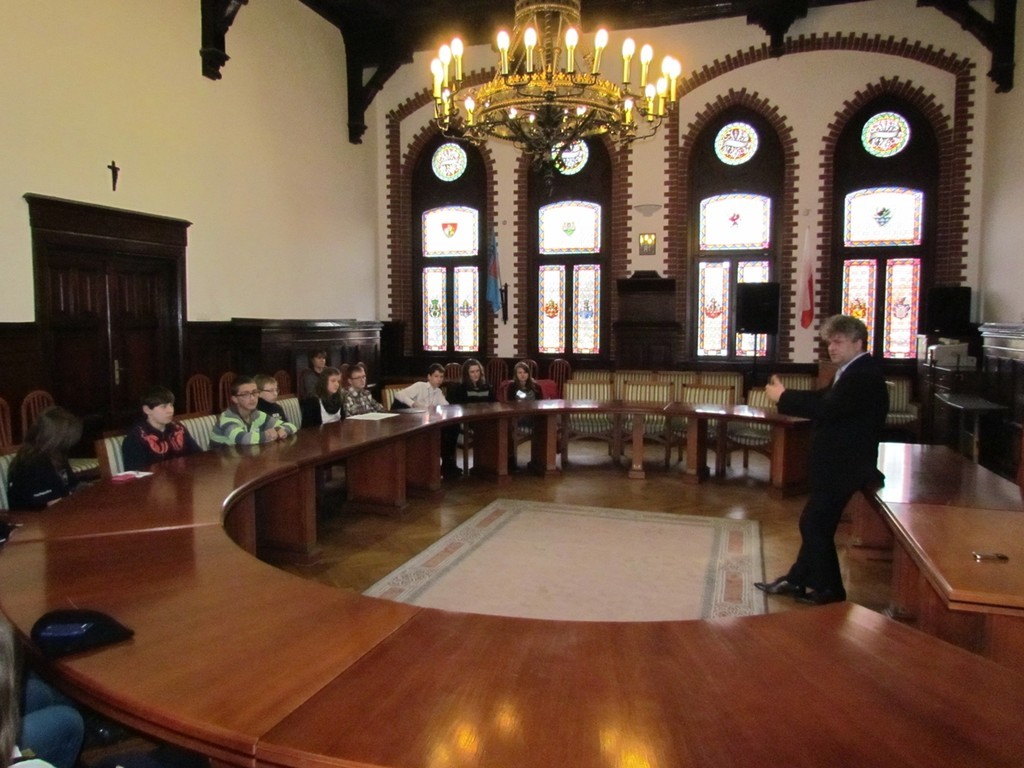 Młodzież spotkała się w Sali rajców z Burmistrzem Miasta Witoldem Namyślaniem. Uczniowie zadawali burmistrzowi różne pytania, które przygotowali na zajęciach dziennikarskich w szkole. Dotyczyły one m.in. młodości i życia prywatnego burmistrza. Nie obyło się też bez pytań dotyczących pracy i obowiązków burmistrza oraz inwestycji, jakie są aktualnie realizowane w mieście, jak również źródeł ich finansowania.