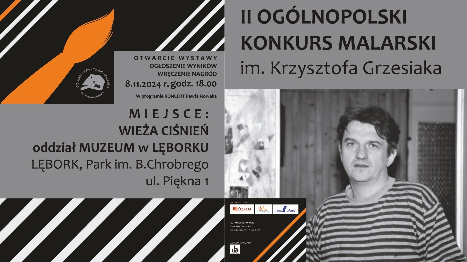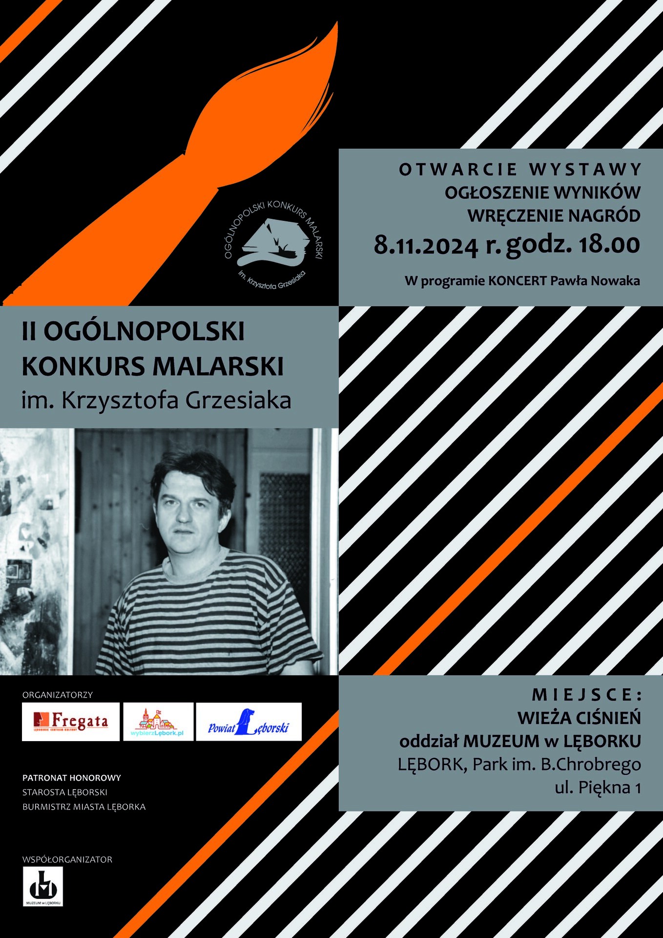 Lęborskie Centrum Kultury "Fregata" wraz z Urzędem Miejskim i Starostwem Powiatowym zapraszają na wernisaż prac II Ogólnopolskiego Konkursu Malarskiego im. Krzysztofa Grzesiaka. Inauguracja wystawy odbędzie się w piątek, 8 listopada br. w Wieży Ciśnień w Parku Chrobrego, przy ul. Pięknej. Początek o godzinie 18.