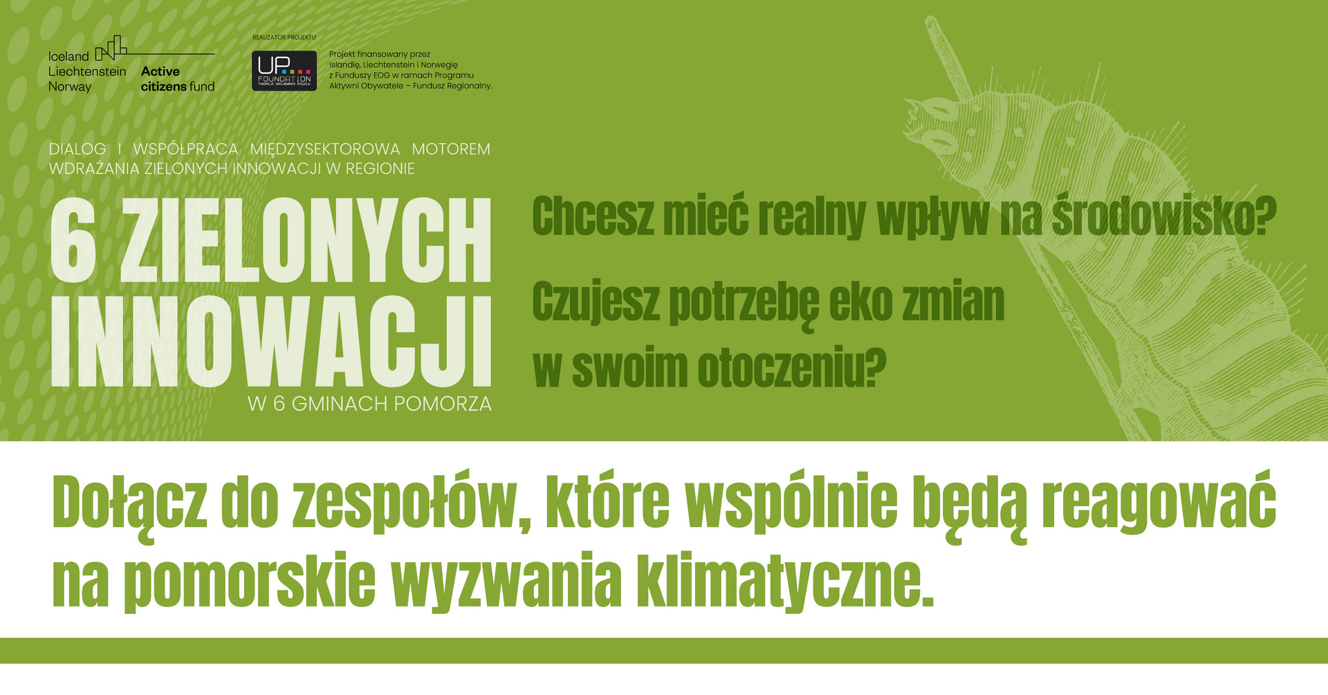 Celem projektu “Dialog i współpraca motorem wdrażania zielonych innowacji w regionie” (Zielone Innowacje) jest zbudowanie kultury współpracy i dialogu społecznego w obszarze środowiska i ekologii między lokalnymi społecznościami oraz samorządami z 6 gmin Pomorza. W ramach tego projektu powstanie 6 interdyscyplinarnych zespołów, w 6 gminach Pomorza. Dodatkowo 20 liderek i liderów z tych zespołów weźmie udział w programie mentoringowym rozwijającym ich kompetencje liderskie, organizacyjne, komunikacyjne i zarządcze. Na zakończenie projektu, pod koniec 2023 roku, na bazie zdobytych doświadczeń powstanie publikacja - innowacyjny manual, w którym opracowany zostanie model współpracy do budowania relacji w społecznościach lokalnych i rozwiązywania wyzwań ekologiczno-społecznych.