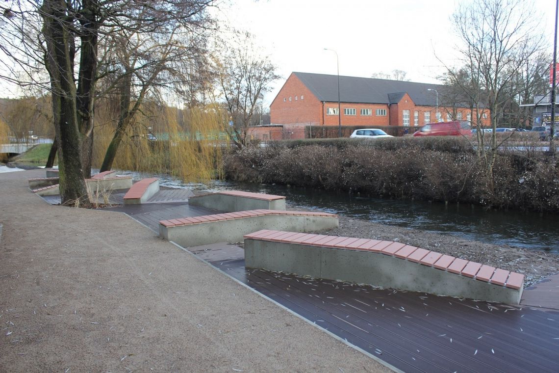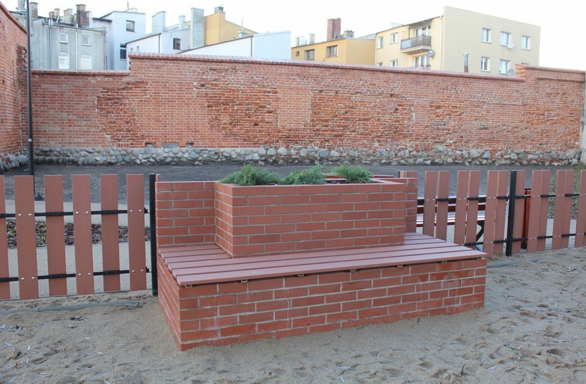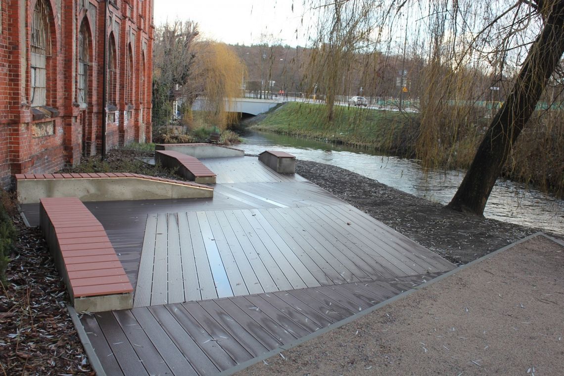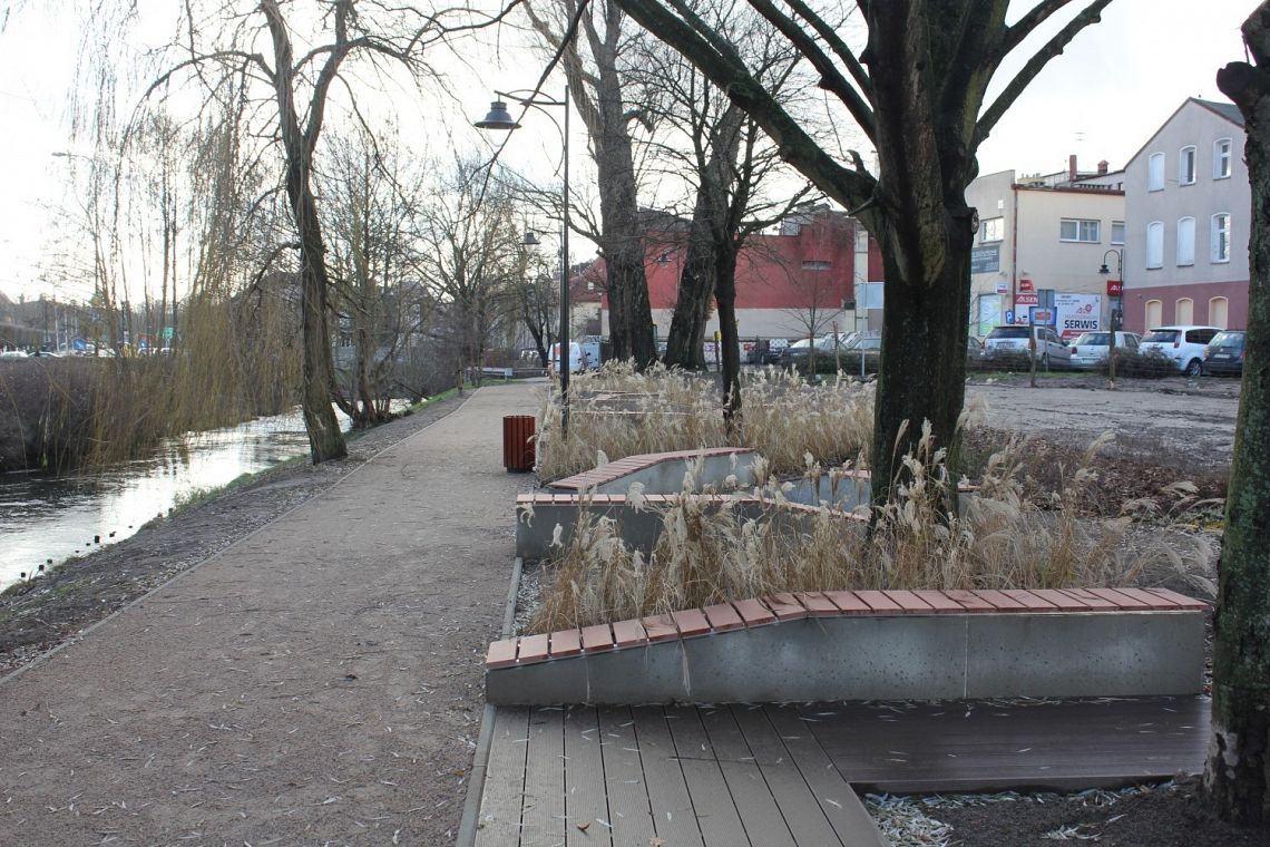 W ramach unijnej inwestycji powstał przyjazny teren rekreacyjny nad rzeką z gliniano-piaszczystymi alejkami i tarasami z desek kompozytowych, oświetleniem parkowymi i iluminacją odnowionych kilka miesięcy wcześniej średniowiecznych murów. Ważnym elementem skweru jest plac zabaw, ścianka wspinaczkowa oraz charakterystyczne ławki z czerwonych cegieł połączone z donicami. Drugi wzór ławek ustawionych nad rzeką oparty jest na połączeniu drewna z surowym betonem. W ramach budowy skweru zagospodarowany został teren o powierzchni 2233m2 i co ważne zachowane zostały wszystkie drzewa. Na terenie skweru zasadzono 2700 roślin. Wśród nich znalazł się jałowiec sabiński, cis pośredni, berberys thuberga, pigwowiec japoński, irga pozioma, trzemielina fortune’a, forsycja, rokitnik, ligustr pospolity, pięciornik krzewiasty, ognik szkarłatny, tawuła japońska, kalina hordowina, różanecznik, azalia, wrzos, winobluszcz, trawa pampasowa, róża okrywowa i parkowa. Na pozostałym terenie zasiana została trawa. Inwestycję zrealizowała firma Usługi Leśne-Budowlane Krystian Wenta z Popowa.