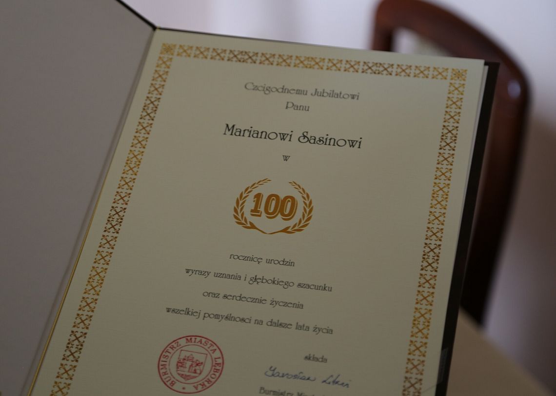 22 lipca 2025 roku pan Marian Sasin obchodził wyjątkowy jubileusz – swoje 100. urodziny. Z tej okazji dostojnego Jubilata odwiedzili z życzeniami i upominkiem zastępca burmistrza Lęborka Krzysztof Król, zastępca kierownika Urzędu Stanu Cywilnego Anna Truszczyńska oraz reprezentantka Kasy Rolniczego Ubezpieczenia Społecznego Beata Kalińska. W spotkaniu uczestniczyła również córka pana Mariana – Zofia Sasin.