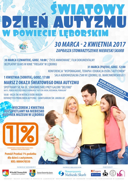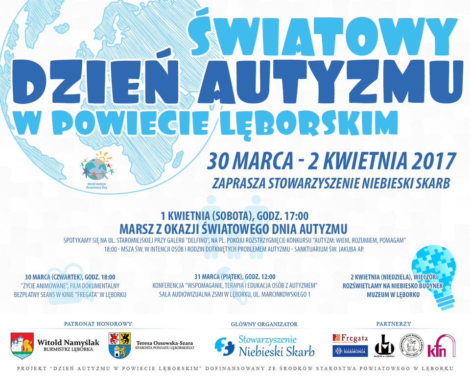 Stowarzyszenie Pomocy Osobom ze Spektrum Autyzmu „Niebieski Skarb” zaprasza do udziału w wydarzeniach Światowego Dnia Autyzmu w Powiecie Lęborskim. Impreza w naszym mieście organizowana jest po raz czwarty. W tym roku odbywać się będzie w dniach od 30 marca do 2 kwietnia 2017r.