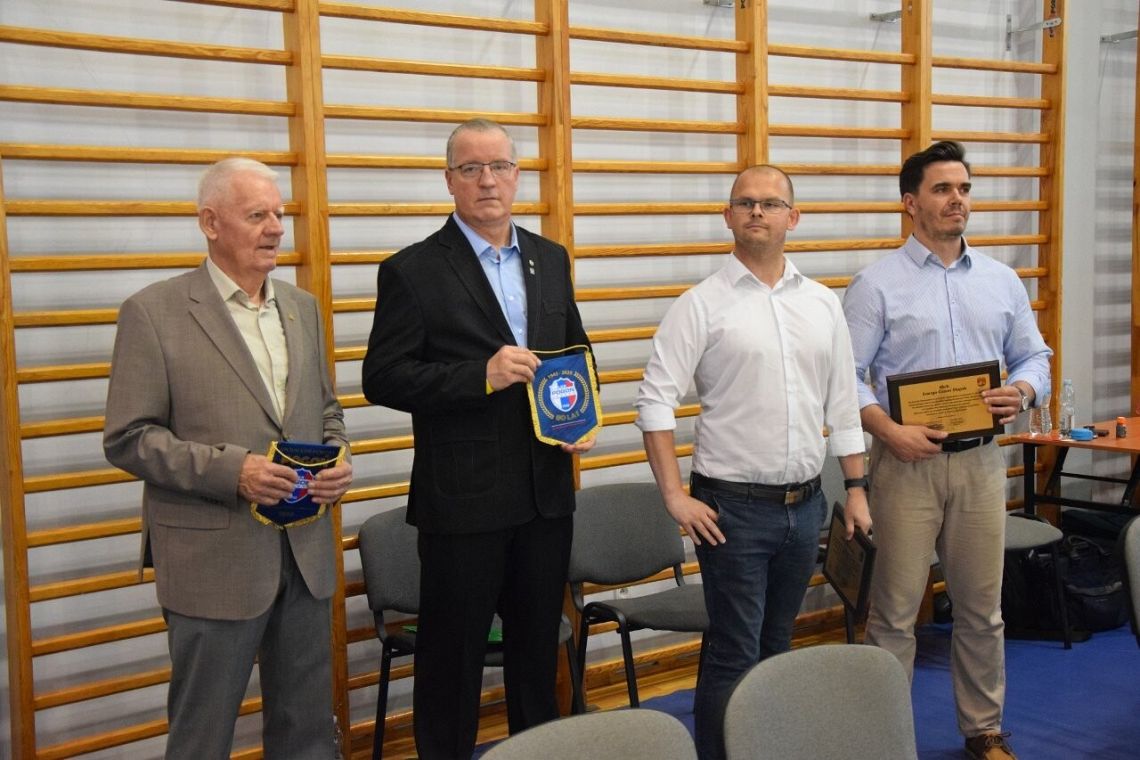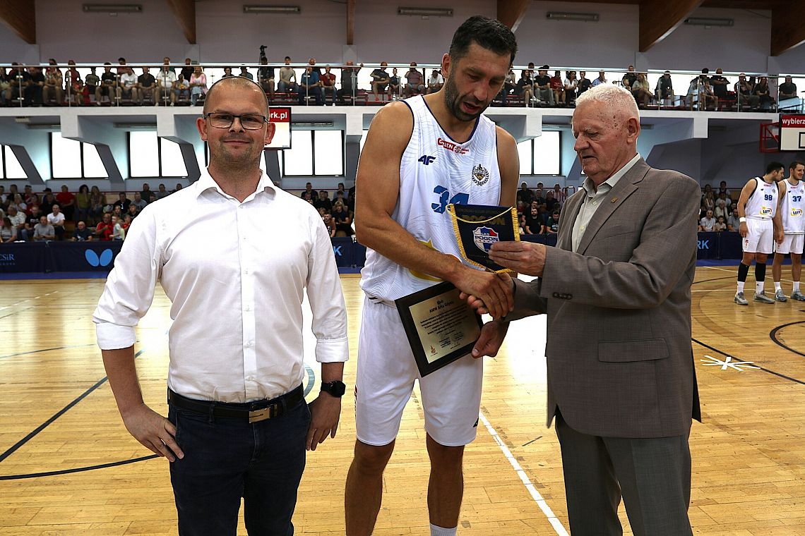 Zanim piłka poszybowała w górę, burmistrz miasta Jarosław Litwin wraz z przewodniczącym Rady Miejskiej Radosławem Zimnowodą wręczyli pamiątkowe grawertony przedstawicielom obu zespołów.