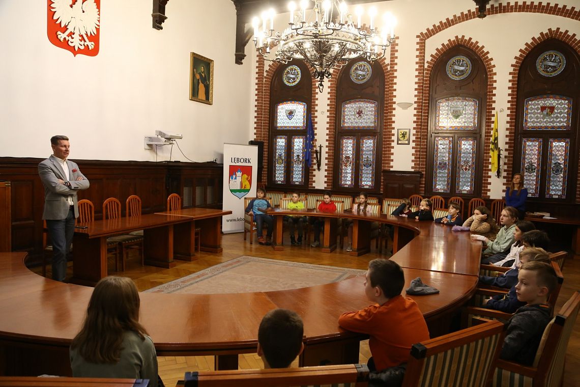 W ramach programu „Otwarta firma” realizowanego przez Szkołę Podstawową nr 1 uczniowie klasy 4 pod opieką wychowawcy odwiedzili lęborski ratusz. Celem spotkania było zapoznanie młodzieży ze specyfiką pracy w urzędzie. Podczas wizyty o zadaniach realizowanych przez urząd miejski oraz pracy urzędników opowiedział Marian Kurzydło – Sekretarz Miasta Lęborka. Zgromadzona młodzież dowiedziała się czym zajmują się pracownicy urzędu oraz poznała zakres zadań, jakie wykonują i jakie sprawy można załatwić w urzędzie. Spotkanie upłynęło w miłej atmosferze. Dodatkowo uczniowie zwiedzili również budynek ratusza, w tym między innymi Salę Rajców oraz skarbiec.