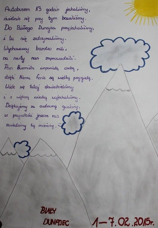Dobiegły końca zimowiska realizowane przez Miasto Lębork w ramach projektów „Nauka z pasją - wyrównywanie szans edukacyjnych uczniów lęborskich gimnazjów” i „Nauka z pasją – wyrównywanie szans edukacyjnych uczniów szkół podstawowych z miasta Lębork”. Dzięki projektowi na tygodniowe zimowiska w Tatry pojechało 467 uczniów lęborskich szkół podstawowych i gimnazjów. Dziś do ratusza wpłynęło podziękowanie w formie wiersza…