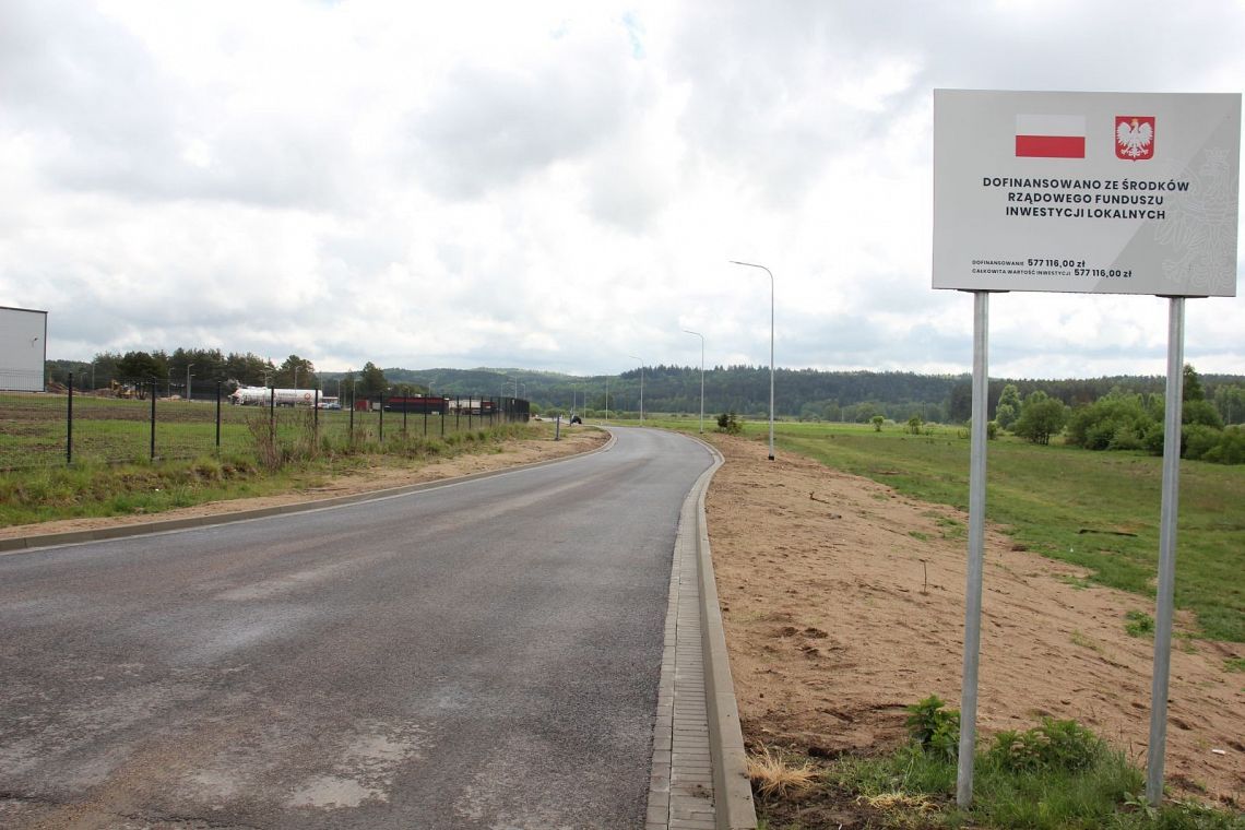 Ta ważna dla ożywienia życia gospodarczego droga otrzymała stuprocentowe dofinansowanie z Rządowego Funduszu Inwestycji Lokalnych. Koszt robót i dotacji wynosi 577.166 zł. Drogę wraz z kanalizacją deszczowa i oświetleniem na zlecenie Miasta Lęborka wybudowała firma Usługi Leśne-Budowlane Krystian Wenta z Popowa.