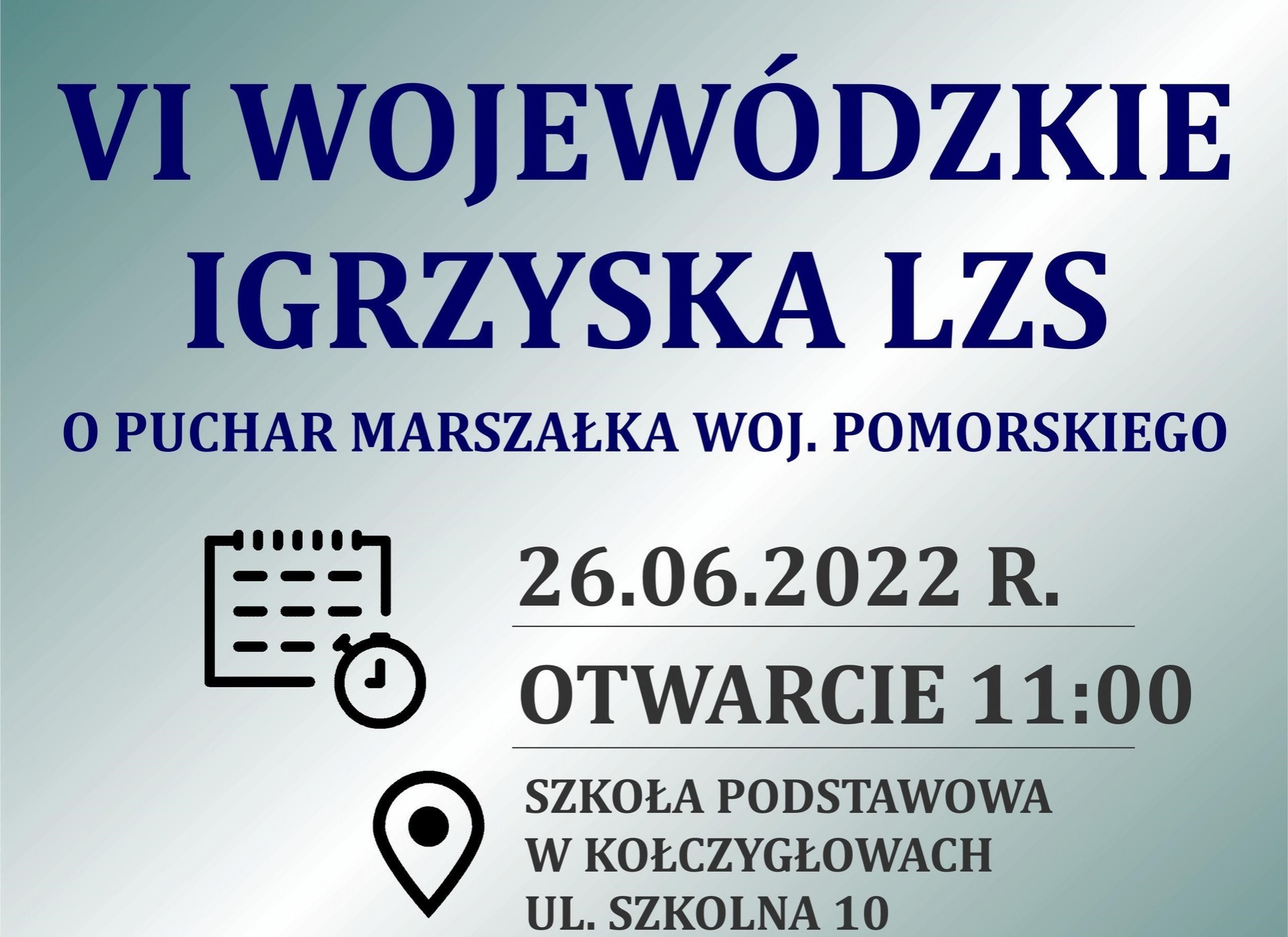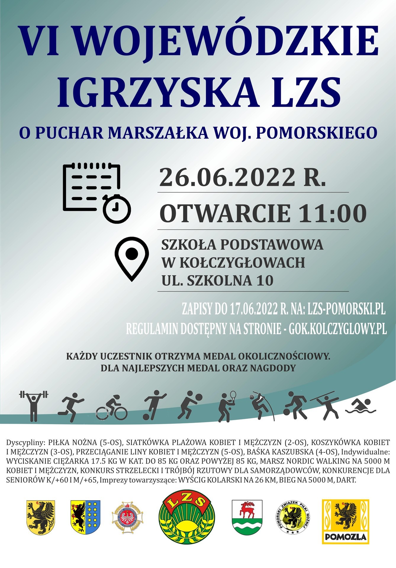 26 czerwca 2022 r. na obiektach sportowych w Kołczygłowach odbędą się VI Wojewódzkie Igrzyska Pomorskie Zrzeszenia LZS o Puchar Marszałka Województwa Pomorskiego.
